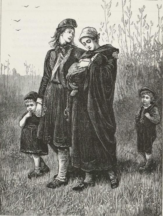 The woman looked at him in terror. She was thin, young, pale, and in tatters. She wore the large hood and woollen cloak of the Breton peasants, fastened by a string around her neck. She left her bosom exposed with the indifference of an animal. Her feet, without shoes or stockings, were bleeding.