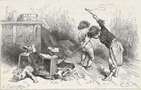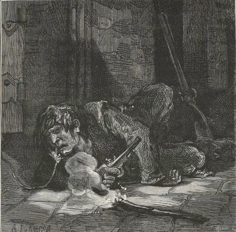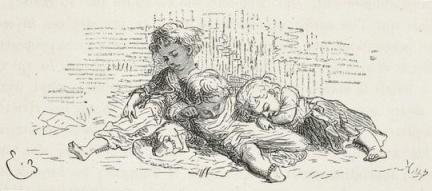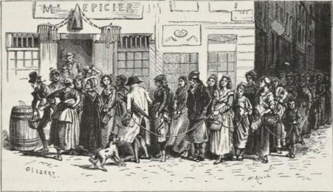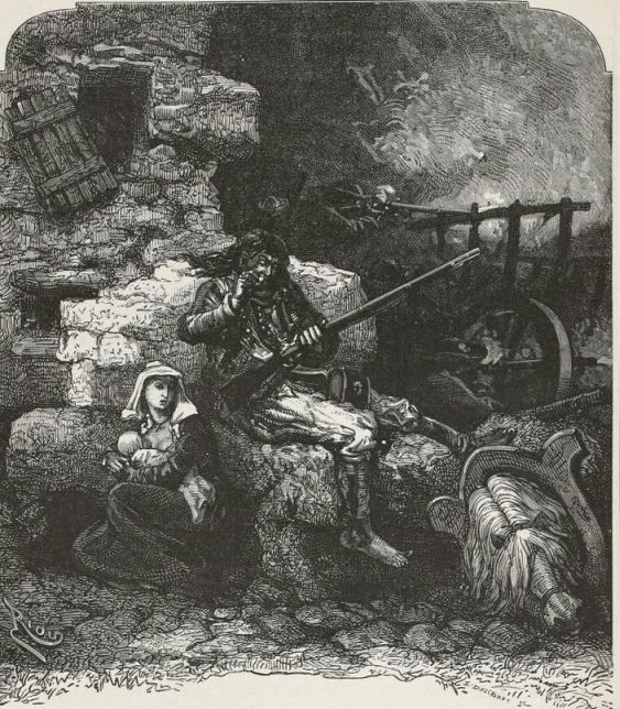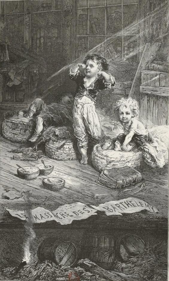 The woman, surprised, bewildered, and stunned, was gazing around, as though in a dream, at these muskets, sabres, bayonets, and savage faces. The two children awoke and began to cry.