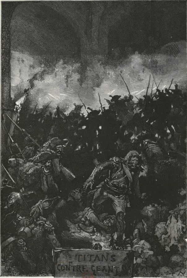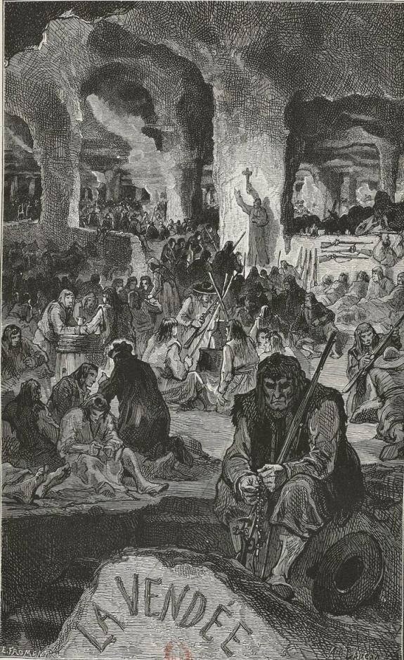 On the 28th of April the Paris Commune had given to the volunteers of Santerre the following order: "No mercy, no quarter." Of the twelve thousand that had left Paris, at the end of May eight thousand were dead. The battalion which was engaged in La Saudraie held itself on its guard. There was no hurrying: every man looked at once to right and to left, before him, behind him. Kléber has said: "The soldier has an eye in his back." They had been marching a long time. What o'clock could it be? What time of the day was it? It would have been hard to say; for there is always a sort of dusk in these wild thickets, and it was never light in that wood. The forest of La Saudraie was a tragic one. It was in this coppice that from the month of November, 1792, civil war began its crimes; Mousqueton, the fierce cripple, had come forth from those fatal thickets; the number of murders that had been committed there made one's hair stand on end. No spot was more terrible.