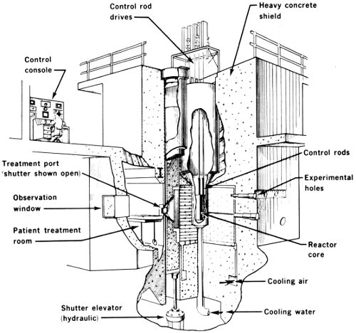 Neutron capture treatment of a brain tumor, using the Brookhaven National Laboratory research reactor (center).