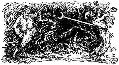 Dann auf einmal ein entsetzliches Getöse, Flüche, Geschrei, Tisch und Sessel flogen mit einem Krach übereinander, dann ein Klirren von Stahl und ein Schmerzensschrei und im nächsten Augenblick sah ich den schwarzen Hund hastig fliehen, der Kapitän ihm eilig nach, beide mit gezogenen Säbeln, und dem Fremden strömte das Blut von der linken Schulter herab. Gerade beim Tor holte der Kapitän mit einem letzten, furchtbaren Hieb auf den Flüchtenden aus, der diesen unfehlbar zerschmettert hätte, wenn er nicht von unserem großen Wirtshausschild aufgefangen worden wäre. Heute noch kann man an der Innenseite des Schildes die Einkerbung sehen.