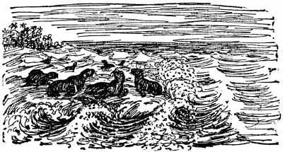 Als ich mit dem Rum zurückkam, saßen die beiden schon, jeder an einer Seite des Frühstückstisches — der schwarze Hund näher zur Tür und seitlich, so zwar, daß er seinen alten Kameraden beobachten und ihm gegebenenfalls auch den Rückzug abschneiden konnte.