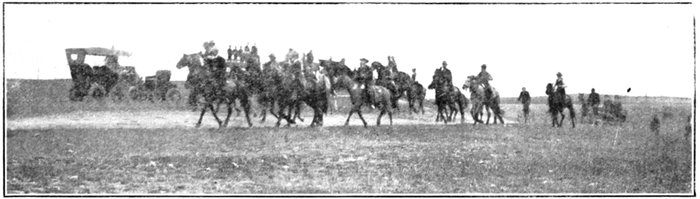 Charles Workman on Teddy took the lead, followed closely by Smith. An automobile which paced the riders for a few miles came back presently to report that these two were already opening quite a gap between them and the rest of the riders. As the day continued the news indicated that Teddy's long stride was carrying him farther and farther to the front, Smith galloping a mile or two behind, with Charlie Trew on Archie hanging to his flanks. Far behind these three came the rest of the field, scattered over many miles of dusty road.