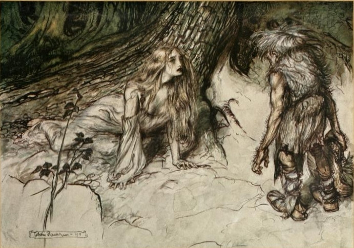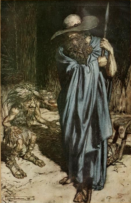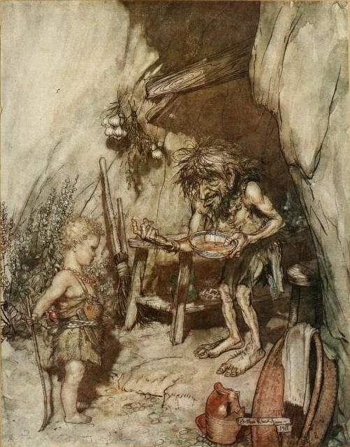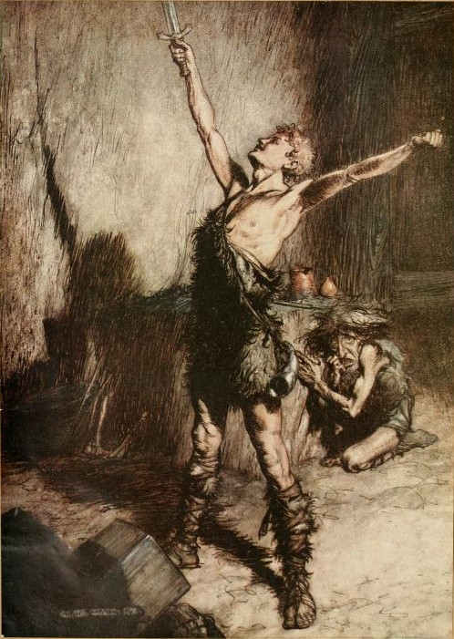 A rocky cavern in a wood, in which stands a naturally formed smith's forge, with big bellows. Mime sits in front of the anvil, busily hammering at a sword.