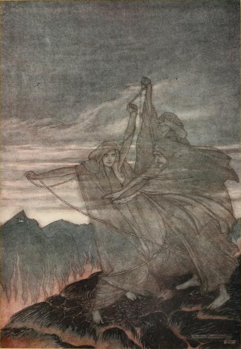 Brünnhilde on Grane leaps on to the funeral pyre of Siegfried—See p. 182