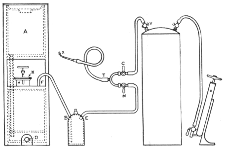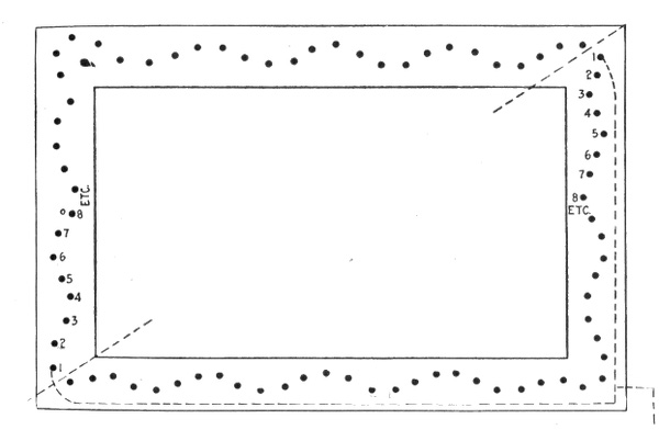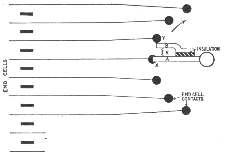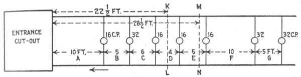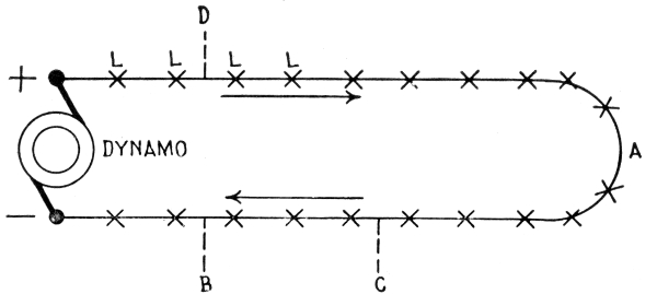 For example. Each open arc lamp requires about 50 volts. In the system shown in fig. 783, the pressure measured across the brushes of the dynamo is assumed to be 1,000 volts. As this current flows through the circuit 45 volts will be actually lost in each lamp, and as the drop on the line wire is usually about 10 per cent. of the total voltage, there will be a drop of 5 volts on the conductor between any two lamps. In the circuit shown, there are twenty lamps, therefore, the difference in pressure between either terminal of the dynamo and middle point A of the circuit will be 10 lamps × 50 volts = 500 volts. Likewise, the difference in pressure between any two points on the circuit will be equal to 50 volts multiplied by the number of lamps included between them.