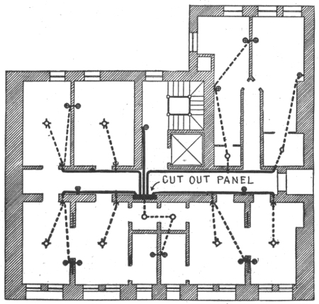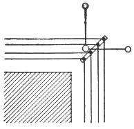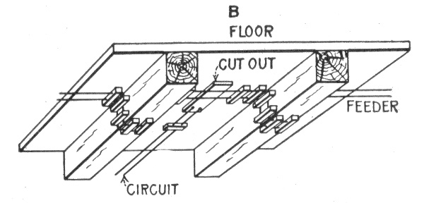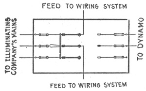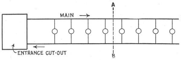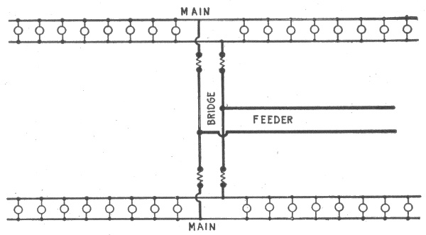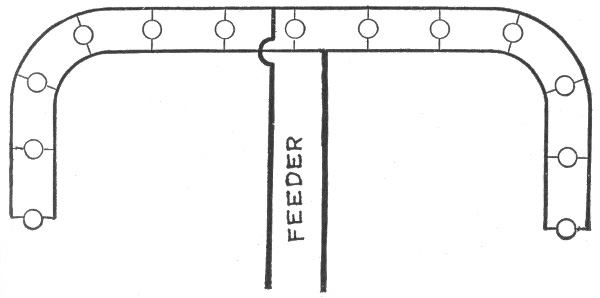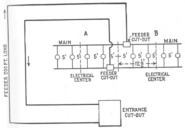 Fig. 785.—Arrangement of feeder and mains in parallel system. By locating the feeder at the electrical center, less copper is required for the mains. The cut does not show the fuses which in practice are placed at the junction of feeder and main.