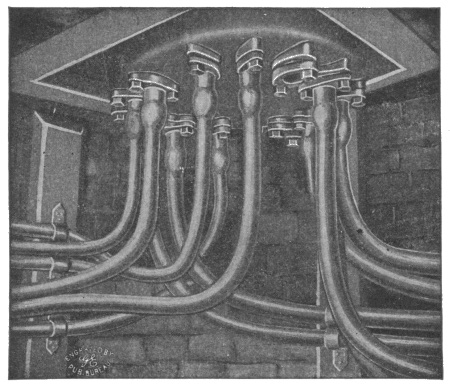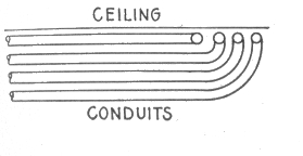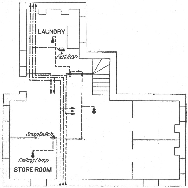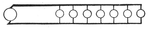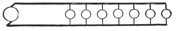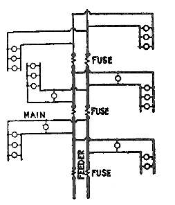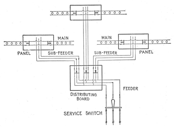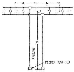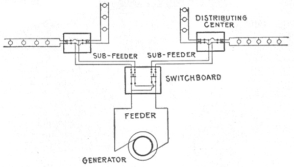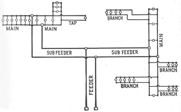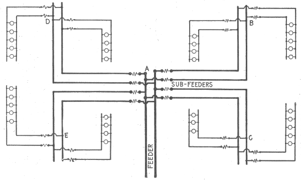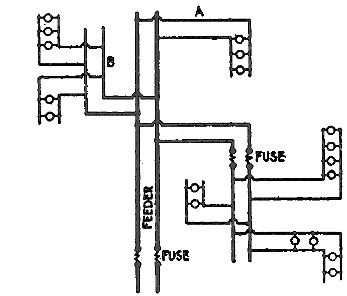 Ans. Conductors known as a feeder run out from the station, and connected to these are other conductors known as a main to which in turn the lamps or other devices are connected as shown in fig. 785.
