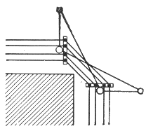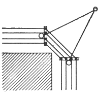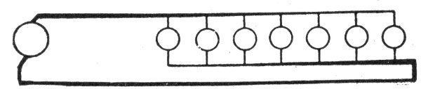 Figs. 786 to 789.—Various parallel systems. Fig. 786, cylindrical conductors parallel feeding; fig. 787, tapering conductors parallel feeding; fig. 788, cylindrical conductors anti-parallel feeding; fig. 789, tapering conductors anti-parallel feeding. The term "tapering" is here used to denote a conductor made up of lengths of wire, each length smaller than the preceding length, the object of such arrangement being to avoid a waste of copper by progressively diminishing the size of wire so that the relation between circular rails and amperes is kept approximately constant. In an anti-parallel system, the current is fed to the lamp from opposite ends of the system.