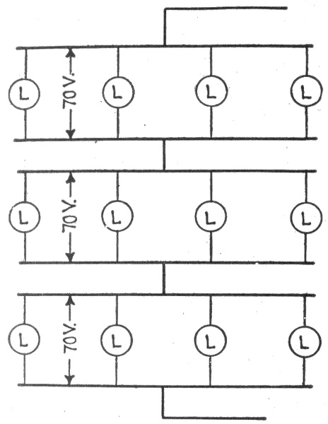 The parallel-series system is employed chiefly in the lighting circuit on electric traction lines; here, usually five 110 volt lamps are connected to the source of supply which has a pressure of 550 volts.