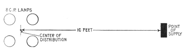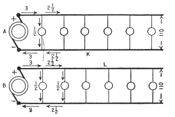Incandescent lamps usually require a pressure of 110 volts, and the current required by a 16 candle power lamp at that voltage is about ½ ampere. Therefore if the lamp be designed for a pressure of 220 volts, the current will be reduced to ¼ ampere, and the same size of wire could be used to feed twice as many lamps.