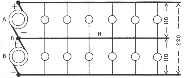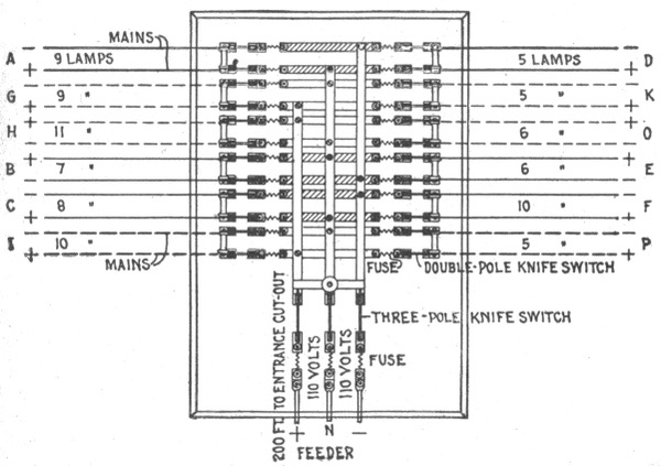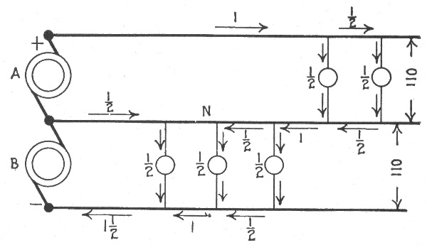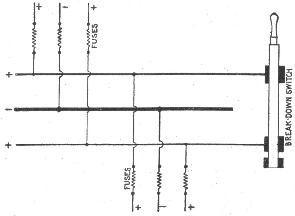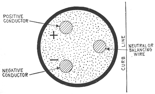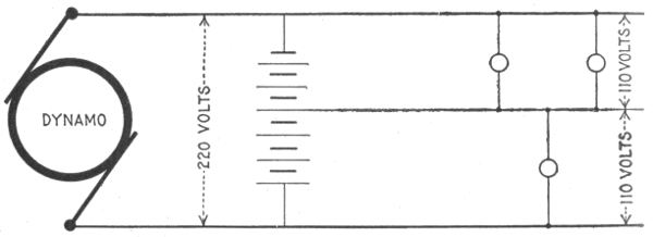Edison Three Wire System.—In electric lighting systems used up to about 1897, it was not considered practicable to use incandescent lamps requiring a pressure exceeding 120 volts. This limited the operating voltage of parallel systems, and necessitated the use of conductors of large size and weight, especially where the current had to be transmitted a considerable distance.