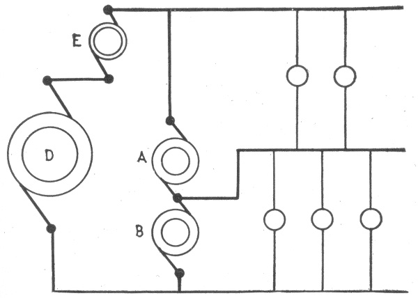 Fig. 790.—Series-parallel system of distribution. It consists of groups of parallel connected receptive devices, the groups being arranged in the circuit in series.