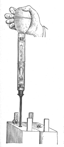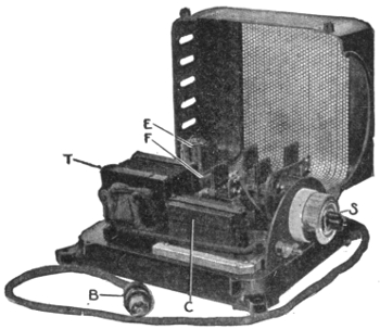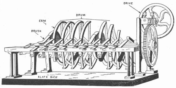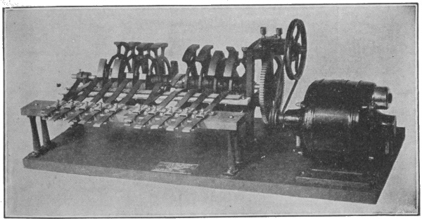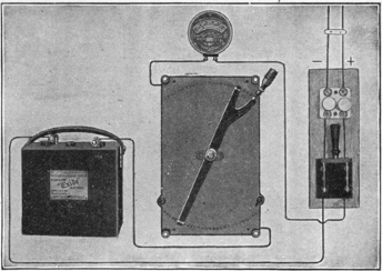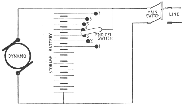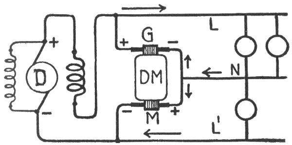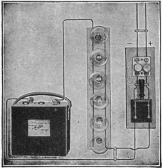 Series System of Distribution.—A series system affords the simplest arrangement of lamps, motors, or other devices supplied with electric energy. The connections of such a system 698 are shown in fig. 783. The current from the terminal of the dynamo passes through the lamps, L, L, L, L, one after the other and finally returns to the terminal. The current remains practically constant, but the voltage falls throughout the circuit in direct proportion to the resistance, and the difference in pressure between any two points in the circuit is equal to the current in amperes multiplied by the resistance in ohms included between them.