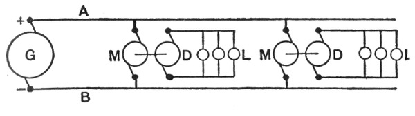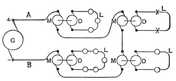 Fig. 791.—Parallel-series system of distribution. It consists of groups of series connected receptive devices, the groups being arranged in the circuit in parallel.
