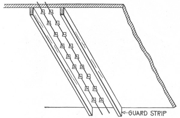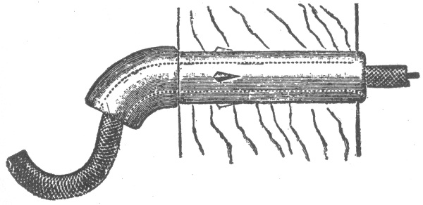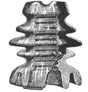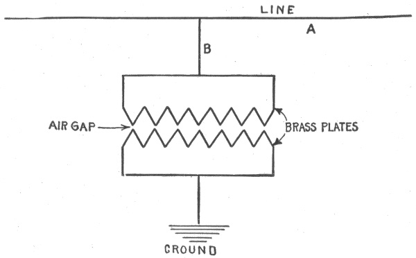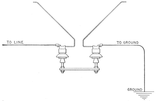 This is illustrated in fig. 783. If the line be grounded at B owing to defective insulation, the pressure of the circuit at that point will be zero, and therefore, a man standing on the ground could touch that point without receiving a shock, but if he should touch the line at the point C, he will receive a slight shock of 150 volts, as there are three lamps between the point C, and the ground connection B. Therefore, the danger of touching the circuit increases directly with the resistance between the point touched and the ground connection, so that if a man touch the circuit at the point D, he will receive a dangerous shock of 16 × 50 = 800 volts. In practice, sixty lamps are often placed on a single arc lighting circuit, so that its total pressure is about 3,000 volts, thus greatly increasing the danger of the system.