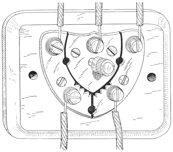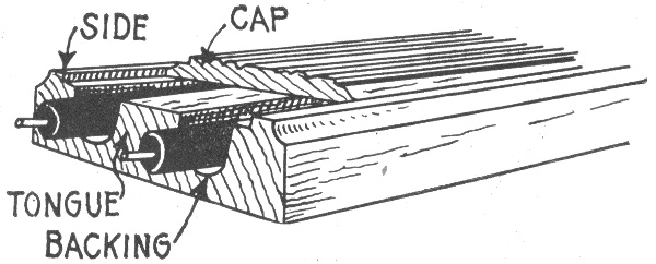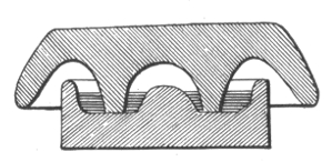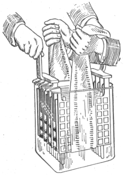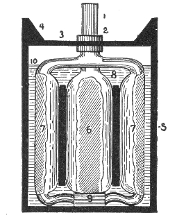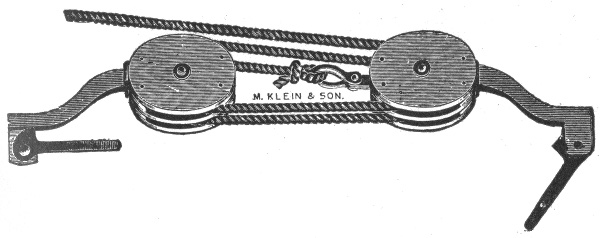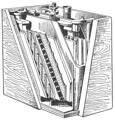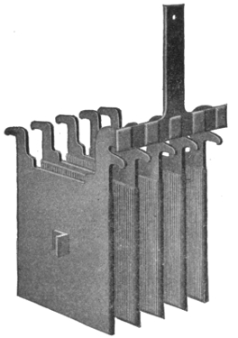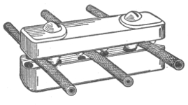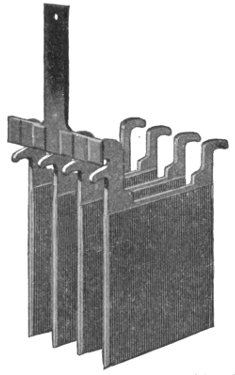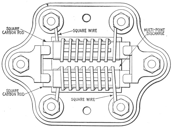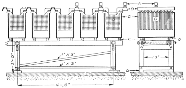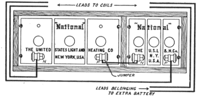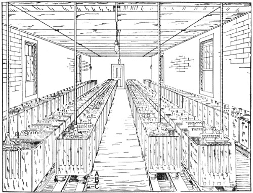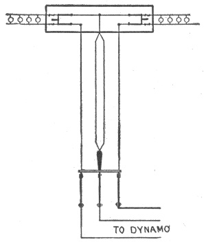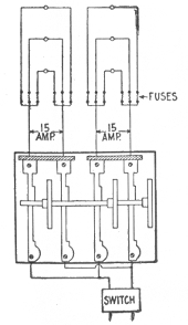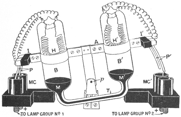 Series-Parallel System.—This is a combination of the series and parallel systems, and is arranged as indicated in fig. 790. Several lamps are arranged in parallel to form a group, and a number of such sets are connected in series, as shown. It is not necessary for the groups to be identical, provided they are all adapted to take the same current in amperes, which should be kept constant, and provided the lamps of each set agree in voltage. For example, on the ordinary 10-ampere arc circuit, one group 703 might consist of 5 lamps, each requiring 2 amperes at 50 volts; the next might be composed of 10 lamps, each taking 1 ampere at 100 volts, and so on.