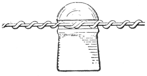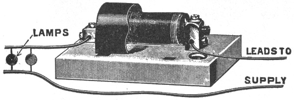 The general principle of the parallel system is shown in fig. 784. With six lamps on the circuit, each requiring one-half ampere of current, at 110 volts, the dynamo will have to supply a current of 3 amperes at a pressure of 112 volts, and this current will flow through the circuit and distribute itself as shown on account of the lesser resistance of the wire relatively to that of the lamps. At the first lamp, the 3 amperes will divide, ½ ampere flowing through the lamp and the remaining 2½ amperes passing on to the next lamp and so on through the entire circuit. The reduction of pressure from 112 volts across the brushes to 110 volts at the last lamp is due to the resistance of the conducting wires.