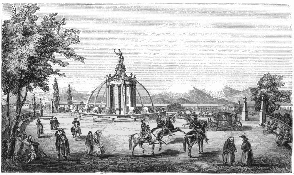 The reader who pictures to himself such a country will easily understand that all temperatures are gained in Mexico on the same parallel of latitude,—or that eternal heat and eternal frost are encountered in crossing the country in a straight line from Vera Cruz to the Pacific coast. It is a country hanging on the two slopes of a mountain, one of which descends to the Gulf and the other to the Western Ocean; and the traveller, in penetrating it, even by the road usually traversed by public conveyances, must attain a height of ten thousand six hundred and sixty feet, before he begins to descend into the valley of Mexico, which is, still, seven thousand five hundred and forty-eight feet above the level of the sea! Thus{12} it is, that throughout the table lands, the geographical position, as far as latitude is concerned, is entirely neutralized by the extreme rarefaction of the atmosphere obtained by ascending through loftier regions. Humboldt graphically declares that climates succeed each other in strata or layers, as we pass from Vera Cruz to the capital, or from the capital, descend to Acapulco or San Blas on the west coast,—beholding in our varied journey, the whole scale of vegetable life. The wild abundance of vegetation on the shore of the Gulf,—its beautiful palms whose stems are wreathed by a myriad of impenetrable parasites which grow with such rank luxuriance in the hot and humid air of the tropics,—are exchanged, as we begin to rise from the level of the sea, for hardier forest trees. At Jalapa the air is milder, though the vapors from the Gulf which concentrate and condense at about this height on the sides of the mountains, sustain the perpetual freshness of the verdure. Further on, the oak and the orange give place to the fir and pine. Here the rarefied air becomes pure, thin and perfectly transparent; but as it necessarily lacks moisture, which condenses below this region, the vegetation is neither so luxuriant nor so constantly vigorous. Great plains or basins, spread out in silent and melancholy vistas before the traveller,—many of them, cold, bleak and lonely moors, whose dreary levels sadden the heart of the spectator. The sun which comes down through the cloudless medium of an atmosphere unscreened by the usual curtain of vapor, parches and crisps the thirsty soil, whilst the winds that sweep uninterruptedly over the unbroken expanse, fill the air, during the dry season, with sand and dust. These high barren plains occupy a large portion of the centre of the country between Zacatecas, Durango and Saltillo; and such is in fact the character of large portions of the whole of Mexico, except when the comparatively level nature of the soil permits the small rivulets that filter from the Cordillera through the narrow vallies, to form themselves into rivers which may be used for irrigation. Wherever this is the case nature at once recovers her vigor under the influence of heat and moisture.