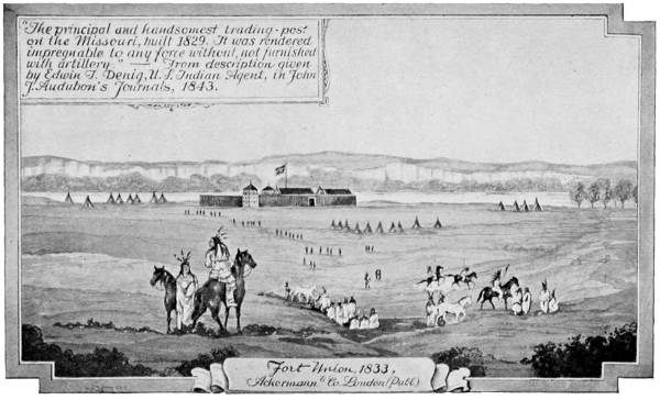 Being a Government scout, Mr. Denig was able to conciliate the Indians during the expedition of Audubon in 1843, making it possible for the great Frenchman to collect his wonderful specimens. A very colorful description of Fort Union was written by Mr. Denig July 30, 1843. This description is found in Volume II, page 180, of “Audubon and His Journals.” In it Mr. Denig writes: “Fort Union, the principal and handsomest trading post on the Missouri River, is situated on the north side, about 6½ miles above the mouth of the Yellowstone River; the country around it is beautiful and well chosen for an establishment of the kind.” Then after describing in detail the structure and furnishings of the fort, he says: “The principal building in the establishment, and that of the gentleman in charge, or bourgeois, is now occupied by Mr. Culbertson, one of the partners of the company,” and farther on, “Next to this is the office, which is devoted exclusively to the business of the company. * * * This department is now under my supervision [viz., E. T. Denig].”