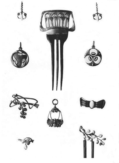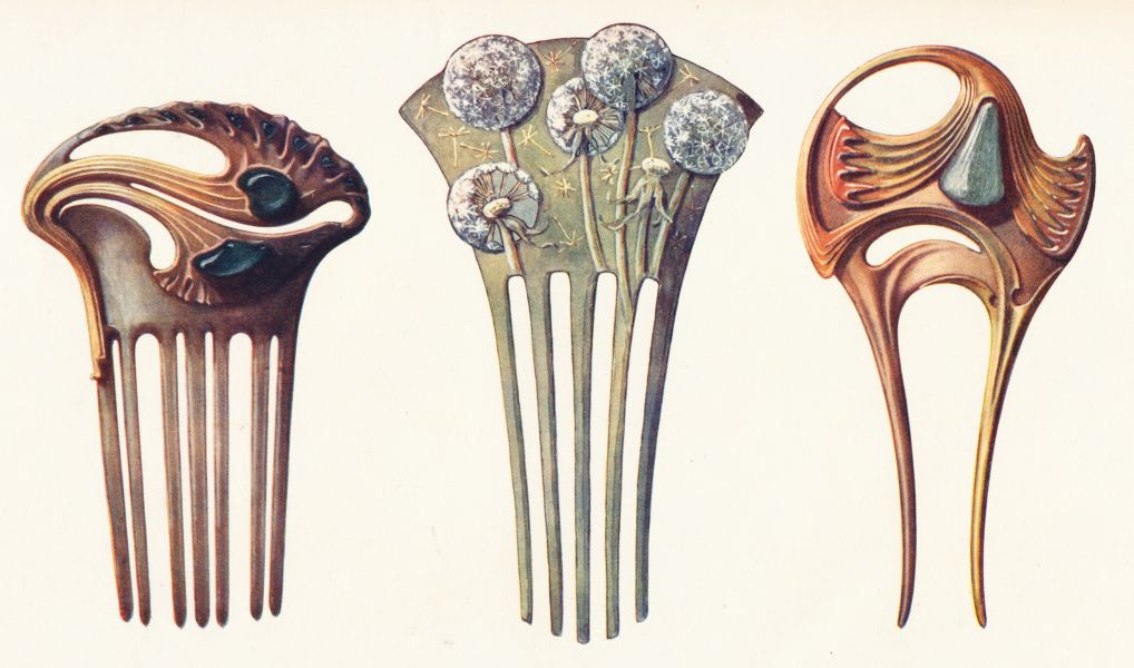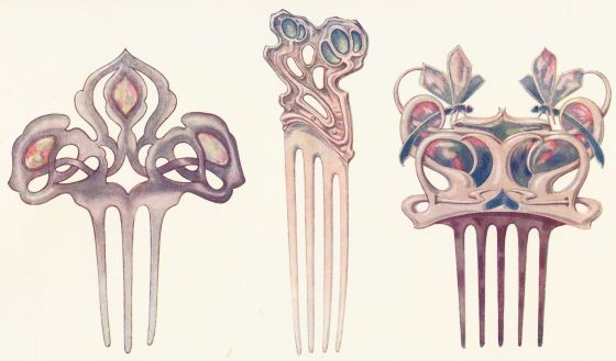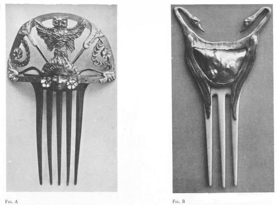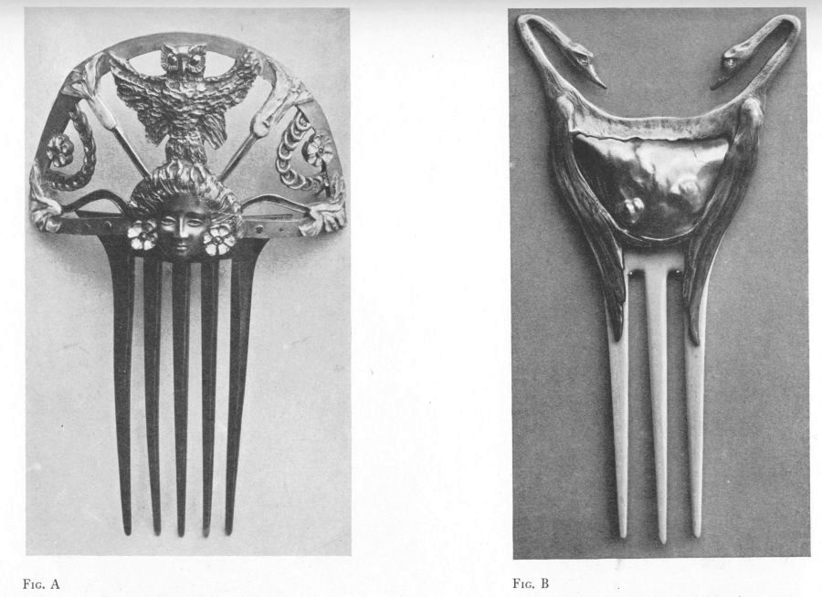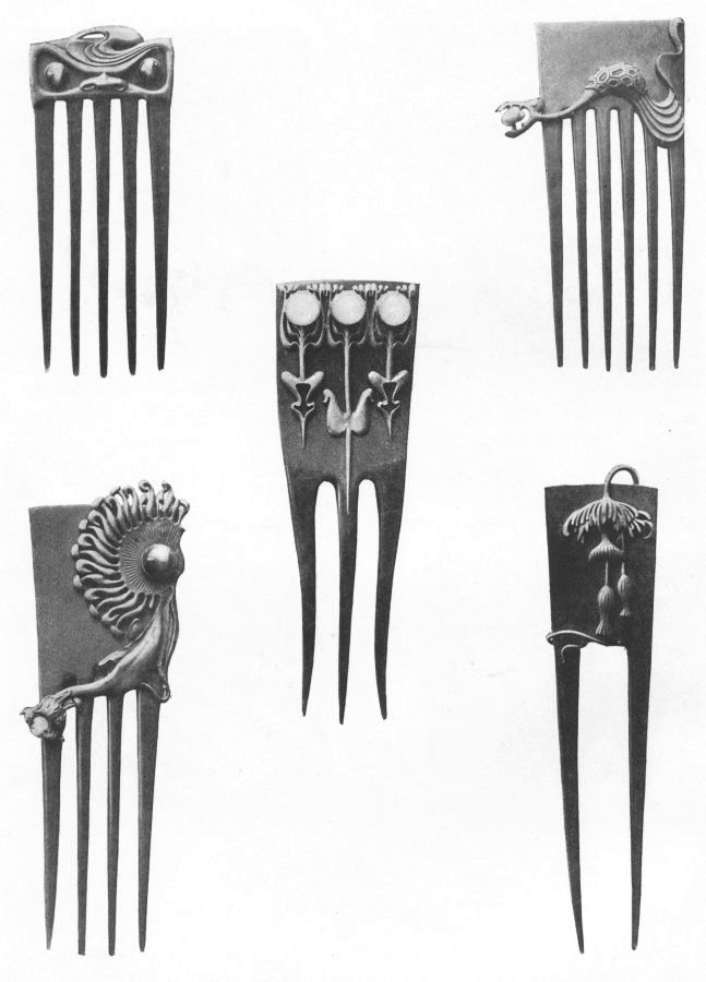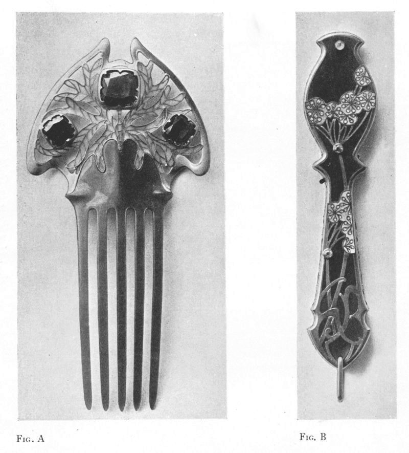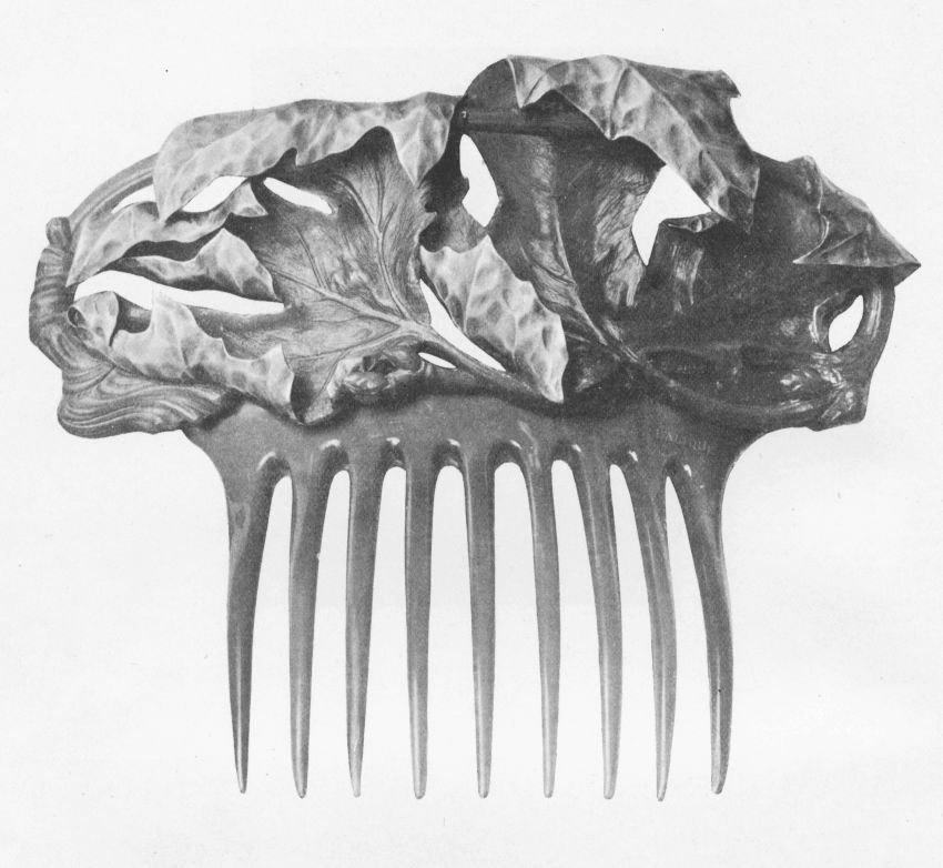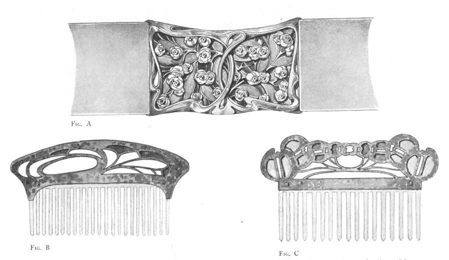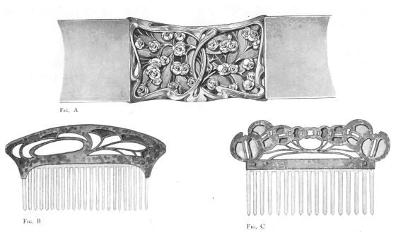 Moyens Bollin, who has lately gone in for the making of artistic metal objects, has also designed several pretty combs, clasps, etc., made in silver or bronze. In the former material is a clasp, of which we give an illustration, with flowers in blossom and bud, admirably drawn so as to fill their allotted space. Another clasp, a butterfly, is in bronze.