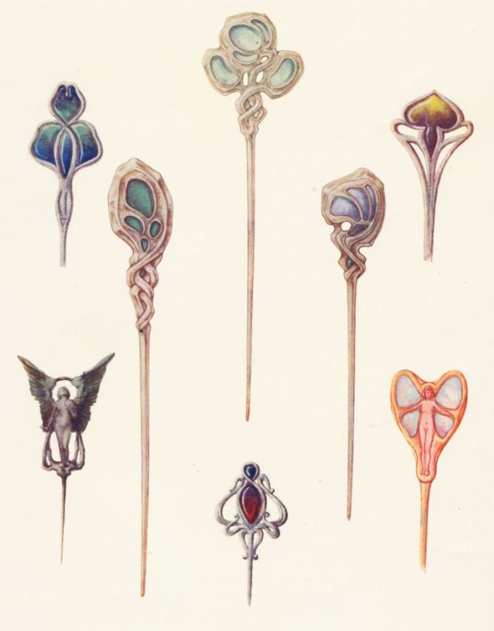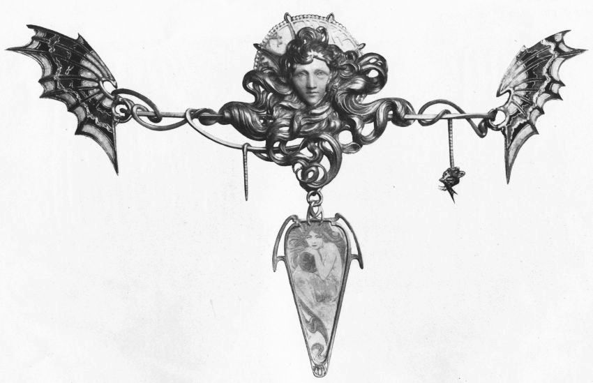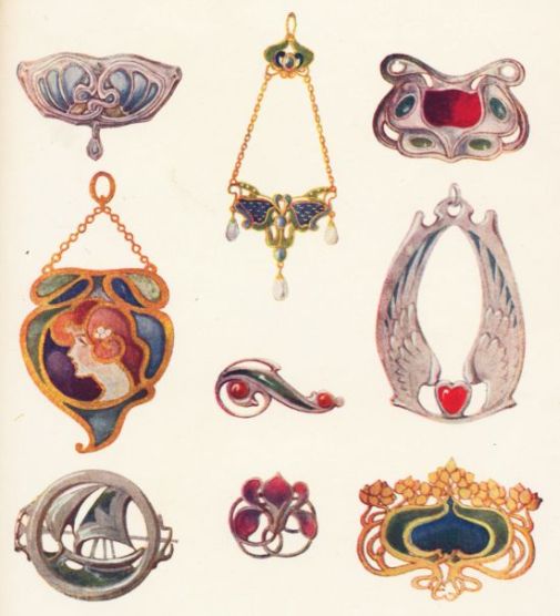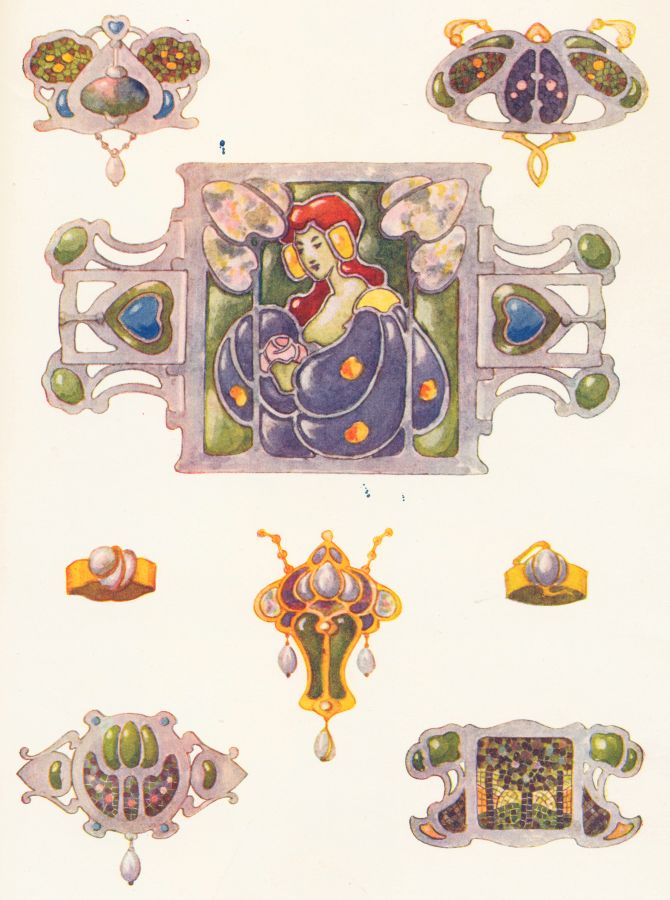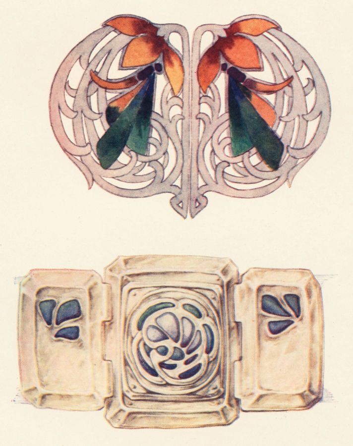 "I am of opinion that the jewel can be produced without the aid of stones, enamels, etc. I do not exclude them entirely, but they should not be used unless it be to give the finishing touch, or occasionally to relieve an ensemble lacking in vigour of colour. My preference is for oxydations, for in general effect they are more harmonious to the eye, and by careful seeking one can find all the tones required. I think you will share my opinion that it is much easier to use enamels, by means of which one's object is instantly attained. Yet it is seldom one produces a beautiful symphony of colour. Enamel can only be employed in small quantities. Why? Because, in the first place, he who uses it must have a profound knowledge of colours and a special colourist's eye; he must remember, moreover, that he is appealing to a clientèle composed principally of ladies, who in most cases regard the jewel simply as a means to complete such and such a toilette.