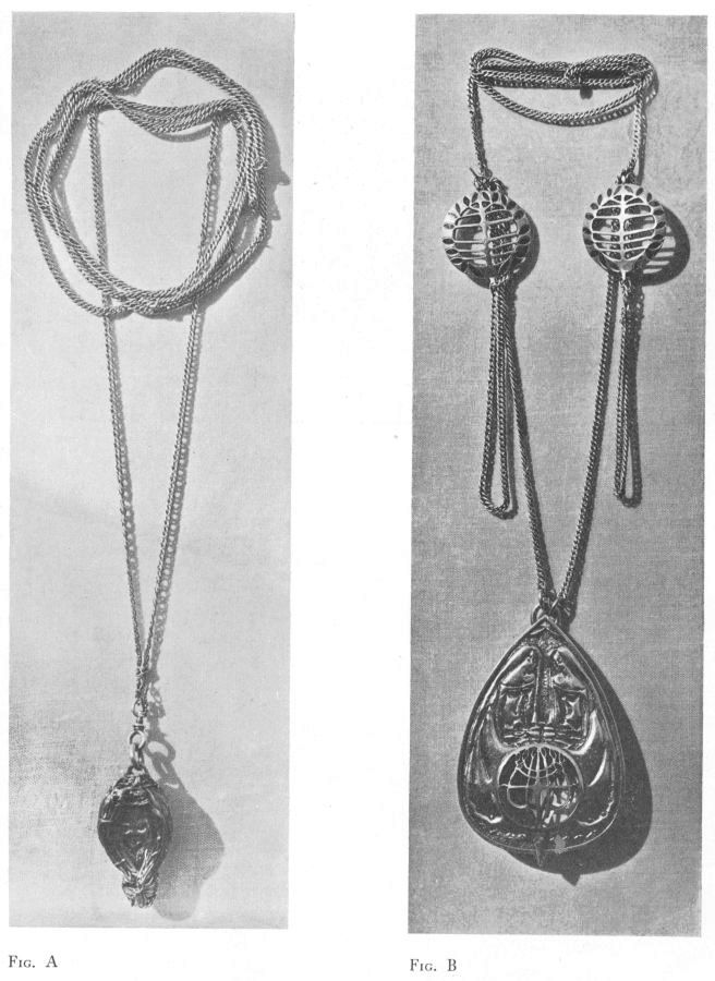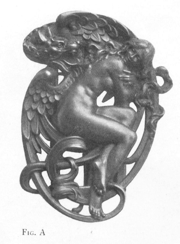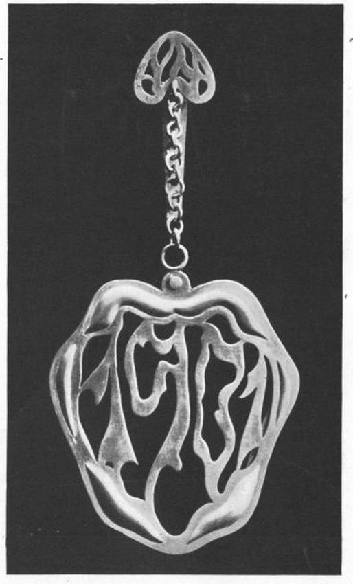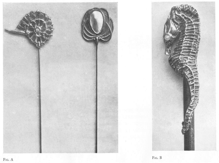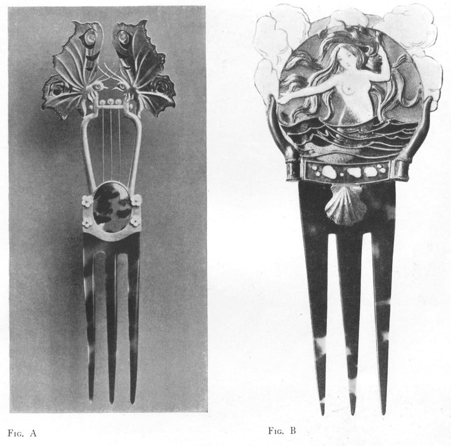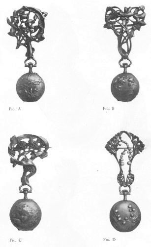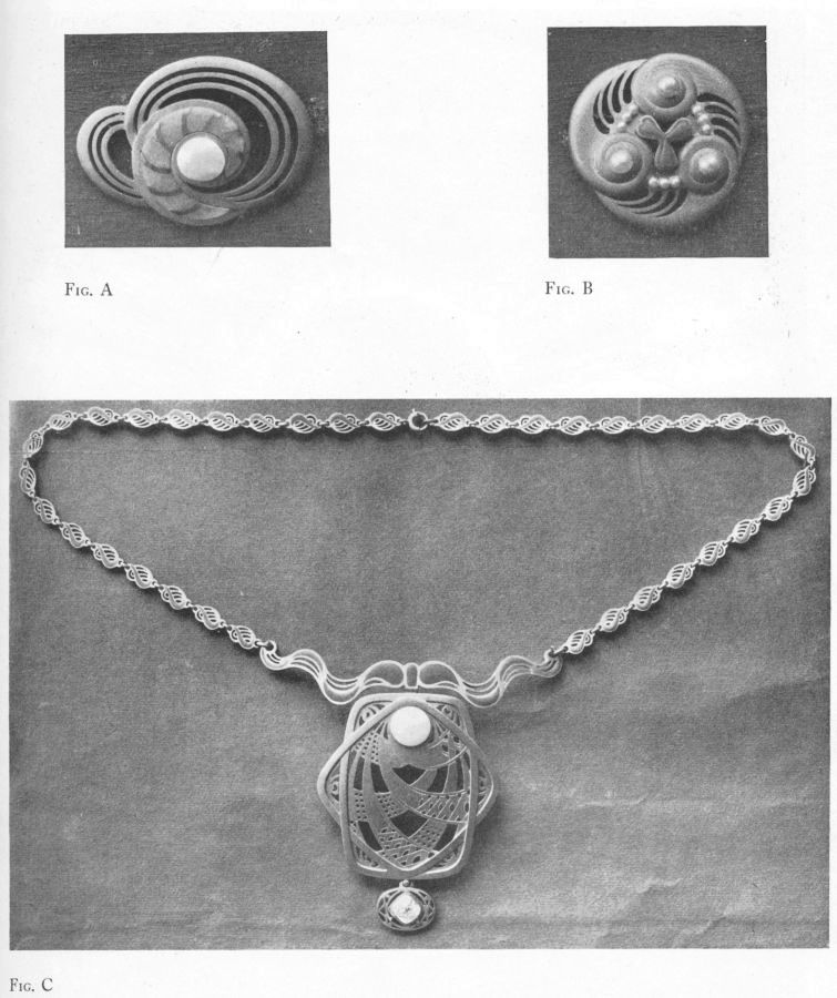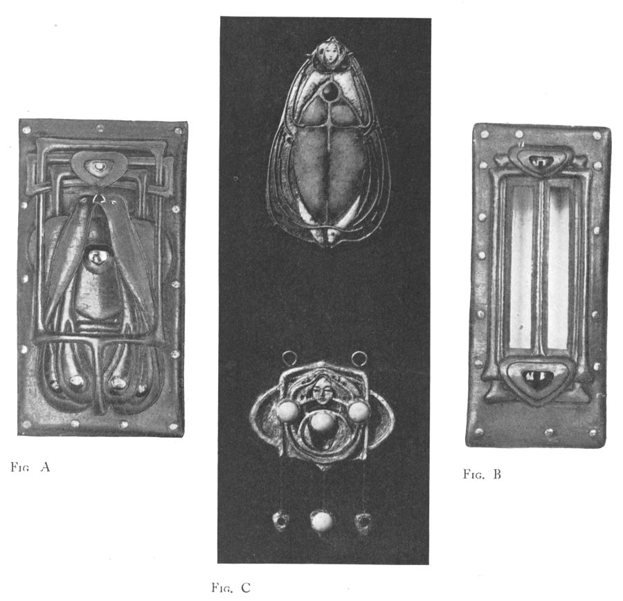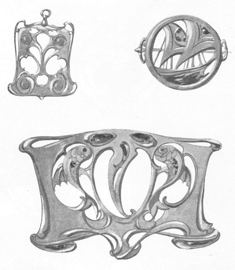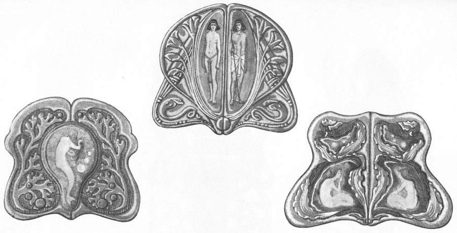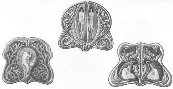 Erick Magnussen is a very young artist, who seems to give promise. The "1901" in the pendant mirror is very deftly drawn, covering its space evenly and well, as does also the design of the "Fish" clasp illustrated. The other, with the mermaids, shows that he can also successfully employ the female form for decorative purposes.