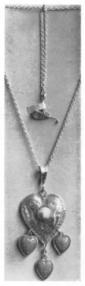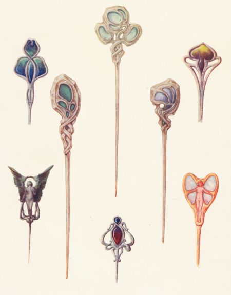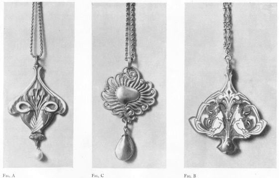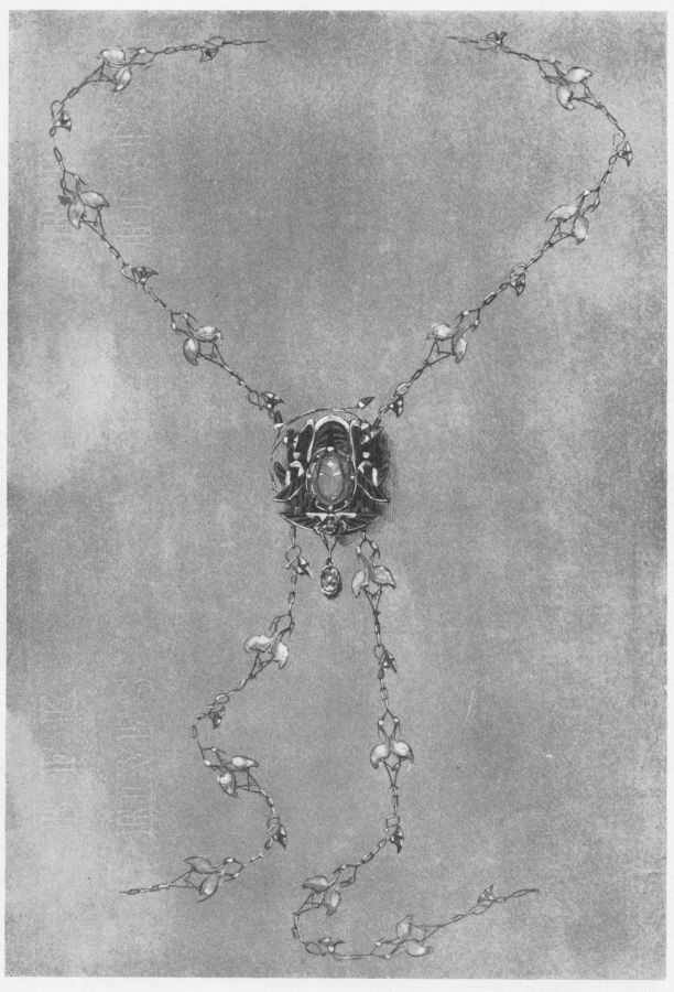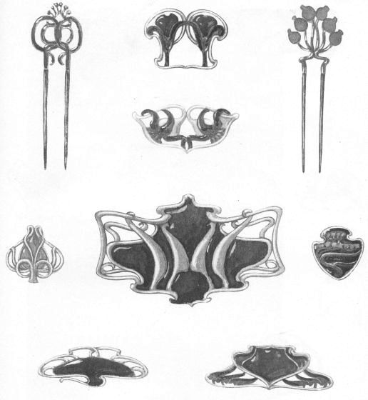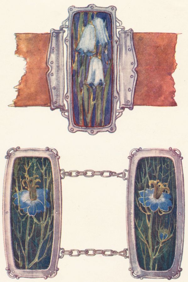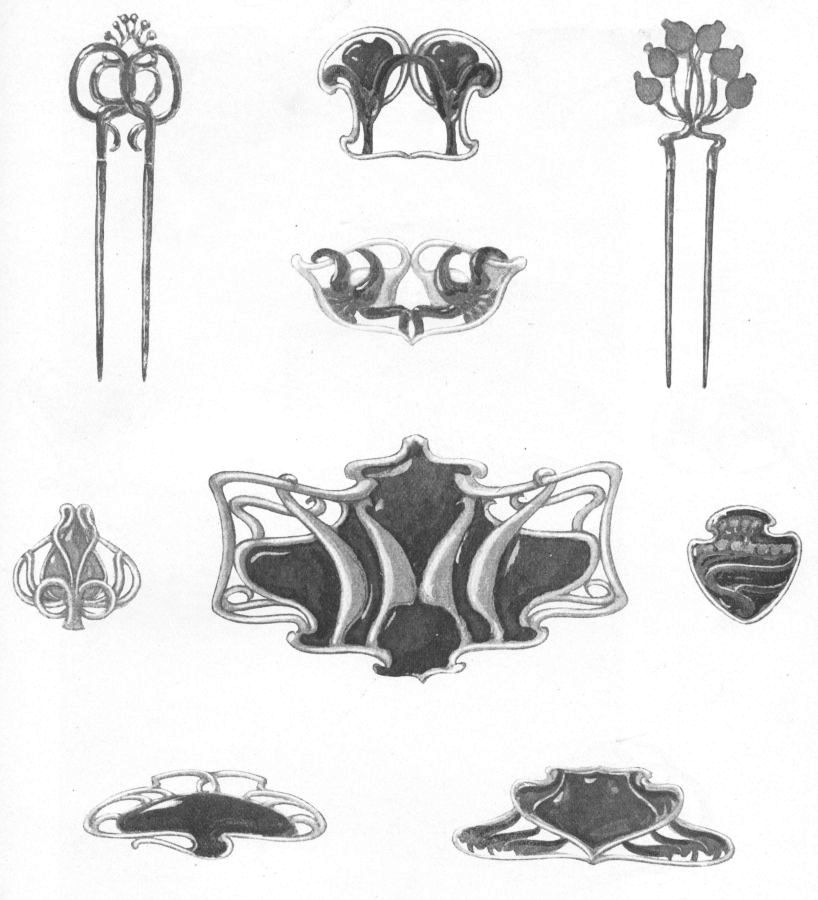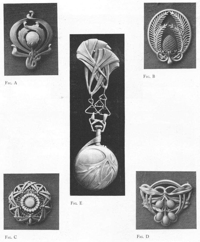 Two of the first to show activity in this direction were the Berlin artists, Hirzel and Möhring. Both chose for their ornaments the same manner and methods which Eckmann and his fellow-workers[2] had previously employed in decorative art; they adhered as closely as possible to simple natural plant-forms, especially Hirzel. Thallmayr, of Munich, is still working in the same style, but with more individuality than Hirzel. Thallmayr will certainly spend his life studying the leaves and blossoms of the trees and the flowers in his garden, while the other will doubtless produce new results, departing somewhat from the real forms of nature. Möhring's works already showed this tendency when he produced them nearly at the same time as Hirzel his. Subsequently these artists were occupied less with women's ornaments than with other things coming within the category of decorative art,—this owing to lack of intelligence and enterprise on the part of the jewellers and manufacturers. Tables, chairs, and other necessary household articles found a much wider market. But we are now dealing exclusively with women's ornaments. Two circumstances in this connection are very strange. In the first place, it seems that the artists of the present time (I speak of Germany) are not successful in designing finger-rings. Here and there one sees an attempt made to design characteristic shapes, but the sphere of the ring is so confined that nobody has succeeded in producing anything really elegant and novel. Mostly one sees extravagant examples, of confused design. The second peculiar fact is, that one very seldom finds an artist devoting himself to designing earrings. The whole artistic movement in relation to women's ornaments is still somewhat puerile. This may be recognised by the absence of the ear-ring, that most superior ornament, which, unlike all others, has an independent language of its own. Although in the list of female ornaments the clasp and the brooch occupy the foremost place, the pendant for the breast should not be forgotten. The mission of the pendant is to show by its fancy and its tastefulness how and in what degree the German is distinguished from the Englishman and from the Frenchman.