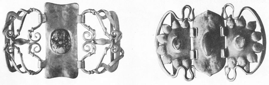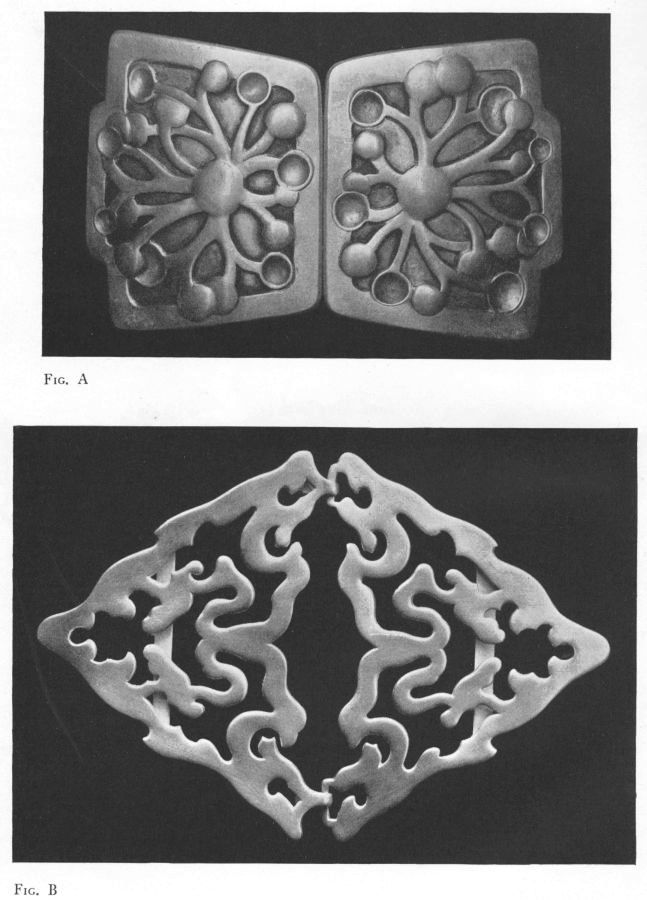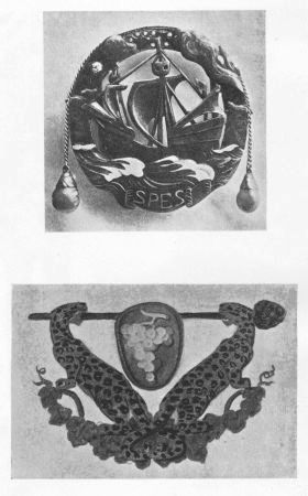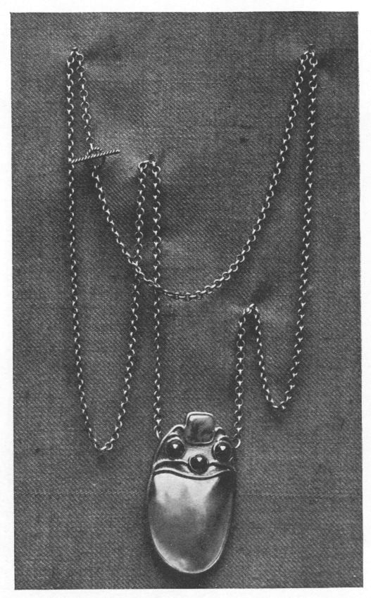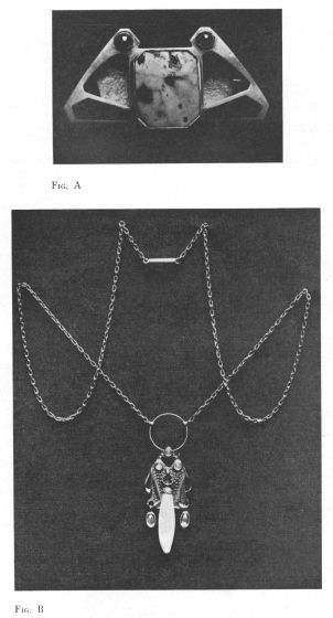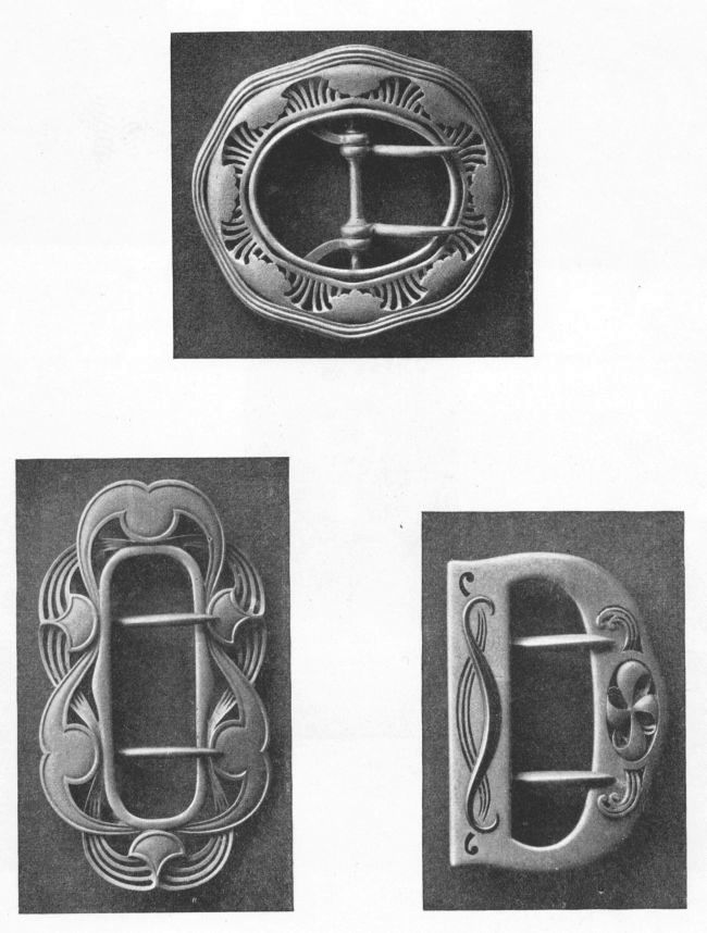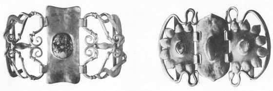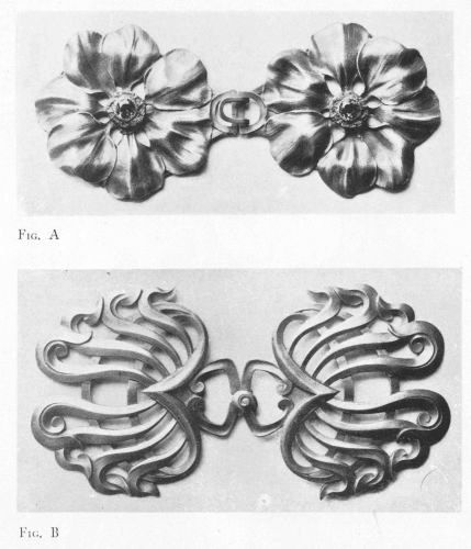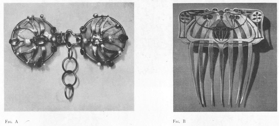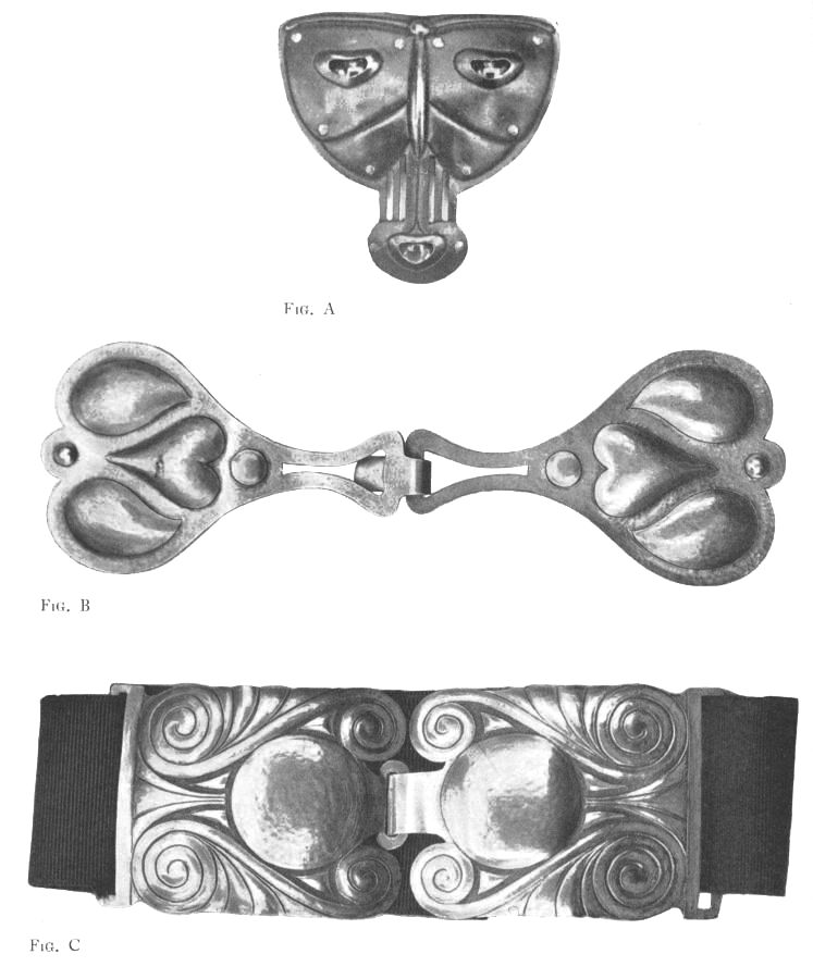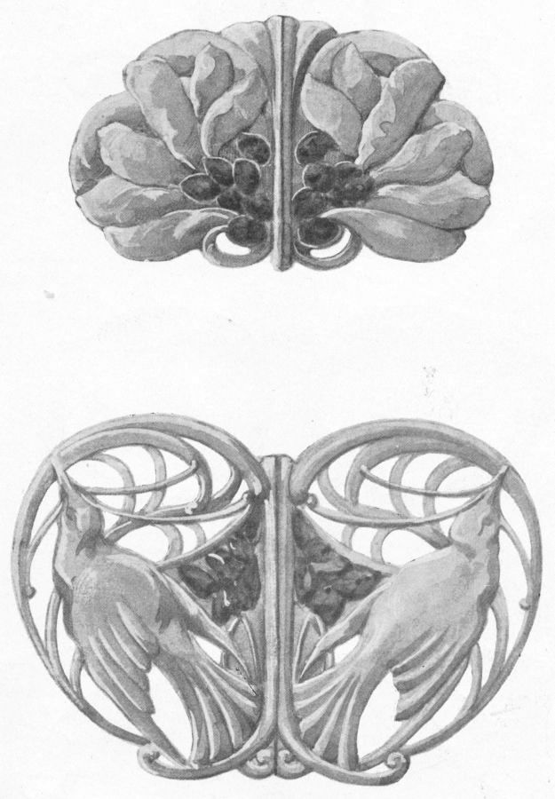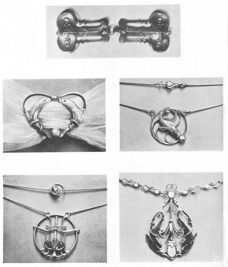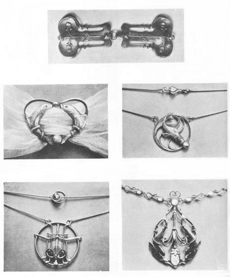 A silver clasp and brooch by Niels Dyrlund are distinguished by a quaint but well balanced intertwining of lines, the effect produced being pleasing and decorative, and Einar Nielsen, the talented painter, Axel Hou, and Georg Jensen have also recently taken to the designing of clasps and such like objects.