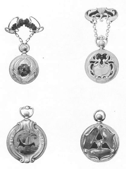 In addition to finger and earrings our jewellery artists are responsible[4] for other objects, such as the bracelet, the watch, and the fan. I think it is very difficult to rescue the bracelet from conventionality. We must hope the best for the future. But what about watch-cases, especially those of ladies' watches? This art is quite neglected, not so much by the manufacturers as by the artists. At this year's Darmstadt Exhibition there were two watches displayed. One of them had the case enamelled, if I mistake not, in the form of a chrysanthemum, and on the other was modelled the figure of one of the "Fates." The effect of the chrysanthemum watch was fairly good, but the less said about the "Fate" the better. Why is it not possible to design an ornament with taste and furnish it with precious stones and enamel? It is the greatest pity that our sculptors have no imagination. Having arrived at the determination to think of a watch, the artist has no idea beyond depicting one of the "Fates" with the thread and the scissors. I said just now that the watch was neglected less by the manufacturers than by the artists. Nowadays you may find watches indeed with gaily-coloured cases, but the decorations are miserable, like everything else that is invented by the manufacturers. They don't want to pay a good price for the artist's sketch, and they are proud of the inspiration of their own Muse. In this case one cannot avoid the conclusion that the artists are themselves to blame for their neglect of this branch of the jeweller's art.