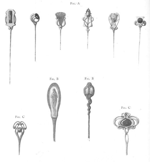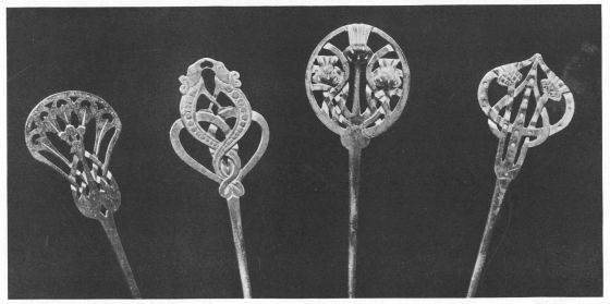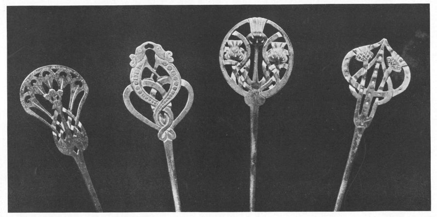 Looking further among our artists, we find Karl Gross, of Dresden. Mr. Gross, who formerly lived in Munich, delighted us while there with a good many beautiful designs for jewellery. He produced not only female ornaments, but also paper-cutters, seals, and so on. He always displayed good taste and a fine sense of form, having, like Olbrich, the capacity to carry out his designs quite independently, without consideration of his predecessors' effects. A hair-pin of Gross's may be regarded as quite an independent work, although it relies on an old tradition. Those artists, indeed, show the most freedom who have adapted the beautiful examples of past generations.