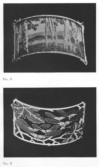 "It seems to me, indeed," continues M. van Strydonck, "that translucent enamel is the most suitable because it simply serves as an auxiliary—a basis necessary to the completion of the ensemble—and adds value to workmanship and design; and there is nothing to prevent its alliance with the beautiful oxydations which come almost naturally from gold."