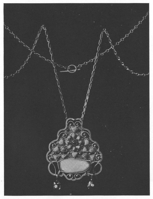 Olbrich's pendants and pins are very characteristic. He takes a hammered gold-plate, enriches it with precious stones and enamel, and adds a rim set with long pearls. It is easy to see that he is fond of[3] rummaging among the treasures of the old cathedrals and convents; he knows the secret of their effect, and, besides this, he has an extraordinary talent for inventing new things himself. His jewellery is the best we have now in Germany, because it is superior to fashions and periods. His jewels are pure, thoughtful works of art. When worn, they produce a most sumptuous effect; but their richness has nothing tawdry about it. These jewels show us how we ought to deck our wives, both at home and at the theatre; moreover, they suggest things fit for the lady superiors of religious orders, for abbesses, even for our queens. They show us too how our burgomasters' chains, with their insignificant crosses and stars, might be improved. These ideas are perhaps at present as intangible as a beautiful dream, but that is no reason why we should not indulge our fancy in this direction. For the moment, however, we must be satisfied if the jeweller is inclined to carry out our designs.