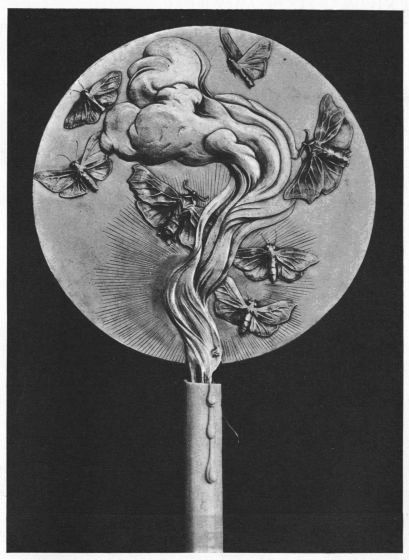 Of a totally different stamp is Harald Slott-Möller, to whom is due the place of honour when dealing with modern Danish jewellery. His designs are carefully conceived and they almost invariably illustrate a fine poetic idea or allegory, always happily chosen. They are somewhat elaborate, both in details and drawing, and in the choice of material, with regard to which he is rather extravagant than otherwise. His jewellery is possessed of a distinguished decorative beauty, and although he is entirely original, both in his choice of motifs and in his way of dealing with them, it might perhaps not be very difficult to trace certain English influences in his work. He is himself a skilful craftsman, whilst some of his designs have been executed at the famous establishment of Mr. Michelsen, Danish Court jeweller. For one of Mr. Michelsen's daughters, Slott-Möller designed the exceedingly beautiful brooch of which we give an illustration (Plate 4). It is made of silver, which is strongly oxidised, with blue, white, and green enamel. The stars are set in diamonds, and the pendants at the side are pearls. The comb with the butterflies on the lyre is the property of another sister, and is made of tortoise-shell and gold, with enamel, set with pearls, diamonds, and sapphires. A second comb, likewise made of tortoise-shell, has for its decorative motif a mermaid, gold, enamel, and coral being used with no mean skill. In the necklace the myth of Helen is represented. The central portion is of dark oxidised silver, with flames and sparks in gold, the walls of burning Troy and the grass are enamel, and the figure of Helen is carved in ivory. On the side plates men fight and die, illustrating the inscription, in Greek: "She brought devastation, she gave fame." Slott-Möller has himself made the whole of this elaborate and charming necklace.[3] The hand-mirror is made in silver, with an ivory handle, in the likeness of a candle, round the flame of which a number of luckless moths flutter; the moths and the ooze from the candle are oxidised.