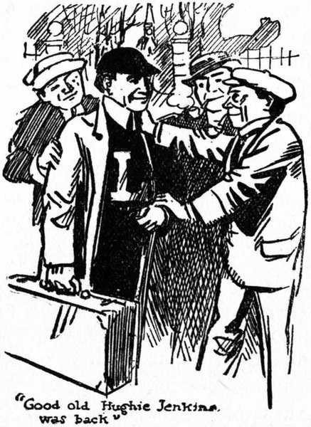 “Eyah! Eyah! Hughie, RAH-RAH.” A wiry red-haired boy about twenty-three years old swung lightly from the train with a big valise in his hand into a crowd of college boys in caps and heavy ulsters. They gathered round him at once, and while one crowd took charge of his valise, he was lifted on to the shoulders of a half dozen fellows and carried through the streets to his rooms in Elihu Dormitory. In a twinkling his rooms and the halls outside were blocked with the lads of Lowell who had come to welcome the most popular boy in school, Hughie Jenkins.