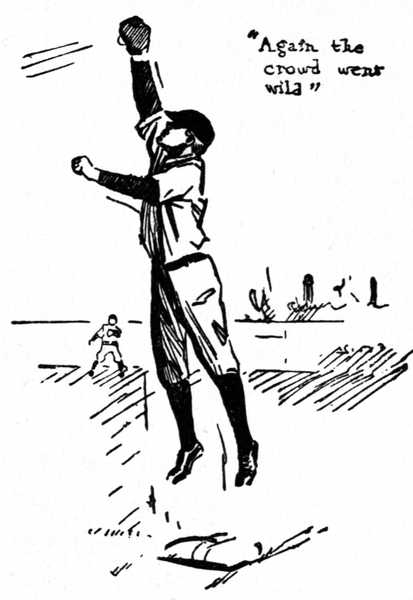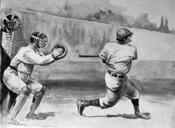 “Once more Mr. Gray Pitch causing ball shoot fast. But Mr. Bat watching very close. He make[296] great smash with large stick against middle of small ball and at once change name to Mr. Run, making great haste leaving home for first white cushion. Then turn, with much glee, from all standers up, on left side and hasten quick after direction ball went toward number two cushion. Mr. Gray Field now pick up ball quick and throw at Mr. Run.