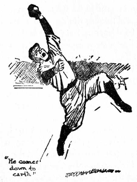 “Walker, the first man up, had gotten to first on a hit and reached second on a sacrifice and he was the lad they said didn’t think quick. This was just the thing we figured might happen. King had said, ‘If that fellow gets on second, I can pull off this new trick, which I call the delayed throw. Let Joe cover the bag and Johnny stall.’ On the first ball pitched, this Walker took a big lead off second, and Brinker covered the bag, King motioned quick as if to throw, and I stood still. Walker first started back toward second, but when he saw that King didn’t throw he slowed down. Brinker, walking back to his place at short, said to Walker, ‘We’d have got you that time, old boy, if King had thrown[6] the ball.’ For just one fatal moment Walker turned around to answer Brinker’s remark and in that instant King threw the ball to me as I hustled for the bag. Of course, I caught it and jabbed it against the runner and before he knew how it was done, he was out.