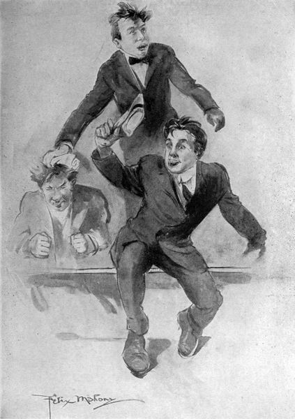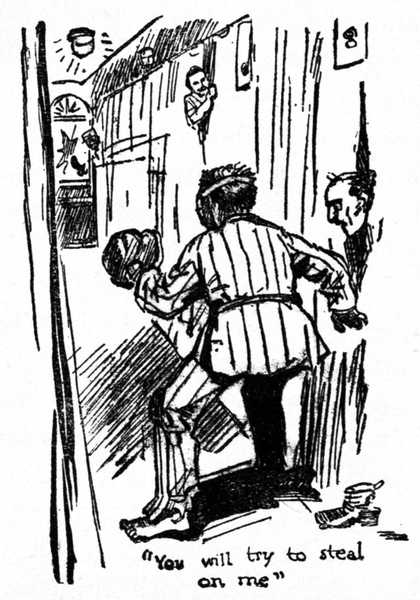 “The captain of the Arson Band sneaked forward to light the fuse and start the conflagration while his pals hauled down the champions’ flag and as the infant burned the third one over the Captain fired a dynamite bomb over Delvin Square to set fire to the[286] city, and the robbers got busy. Little Arthur, however, guarding his station, was prepared to die a patriot and although he had to handle it with gloves he knocked it down and quickly turned in the alarm calling out all reserves.