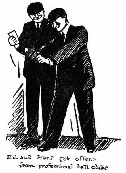 Hans, of course, standing head and shoulders above all of them in the records, carried off the prize as the best all-round man. Hagner was, next to Hal, the happiest man in school. No more selling books for him. His college course was assured. Furthermore, he received an invitation from the Pirates to join them at the end of his course at a salary which was so tempting that right then he signed a contract to begin as soon as he graduated, or before, if he chose.