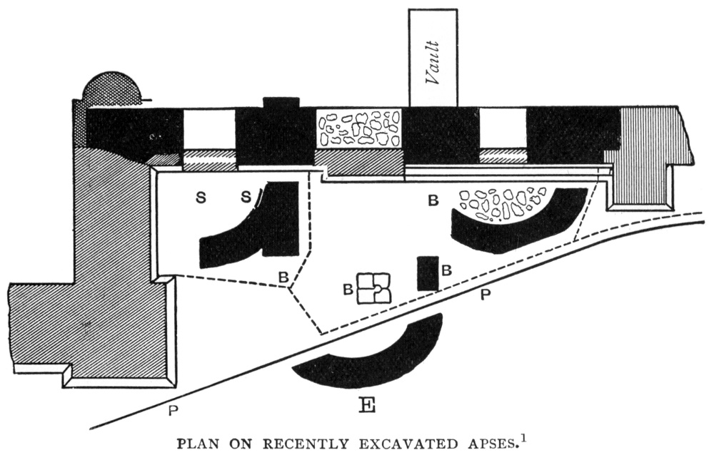 This closes the first era in the history of the church: the old ecclesiola of Didan and his daughter was gutted by the fire, and its roofs and furniture destroyed. Indeed, until lately it was held that the whole building was of wood, and perished therefore with the tower and roof, no vestige of it remaining for later times. But the recent investigations of Mr. J. Park Harrison, an archaeologist of remarkable devotion and insight, have proved that the east wall of the eighth century church, with two of its primitive arches, still remains, a venerable relic of times past, as part of the wall of the cathedral; while the foundations of the three apses, into which the three low arches once led, have been discovered in the garden to the north-east of the church (see pp. 33, 34). So did Anthony à Wood, when in the seventeenth century he wrote of "the antientist buildings" as "on the east and north side of the church," speak more truth than even he himself was aware.