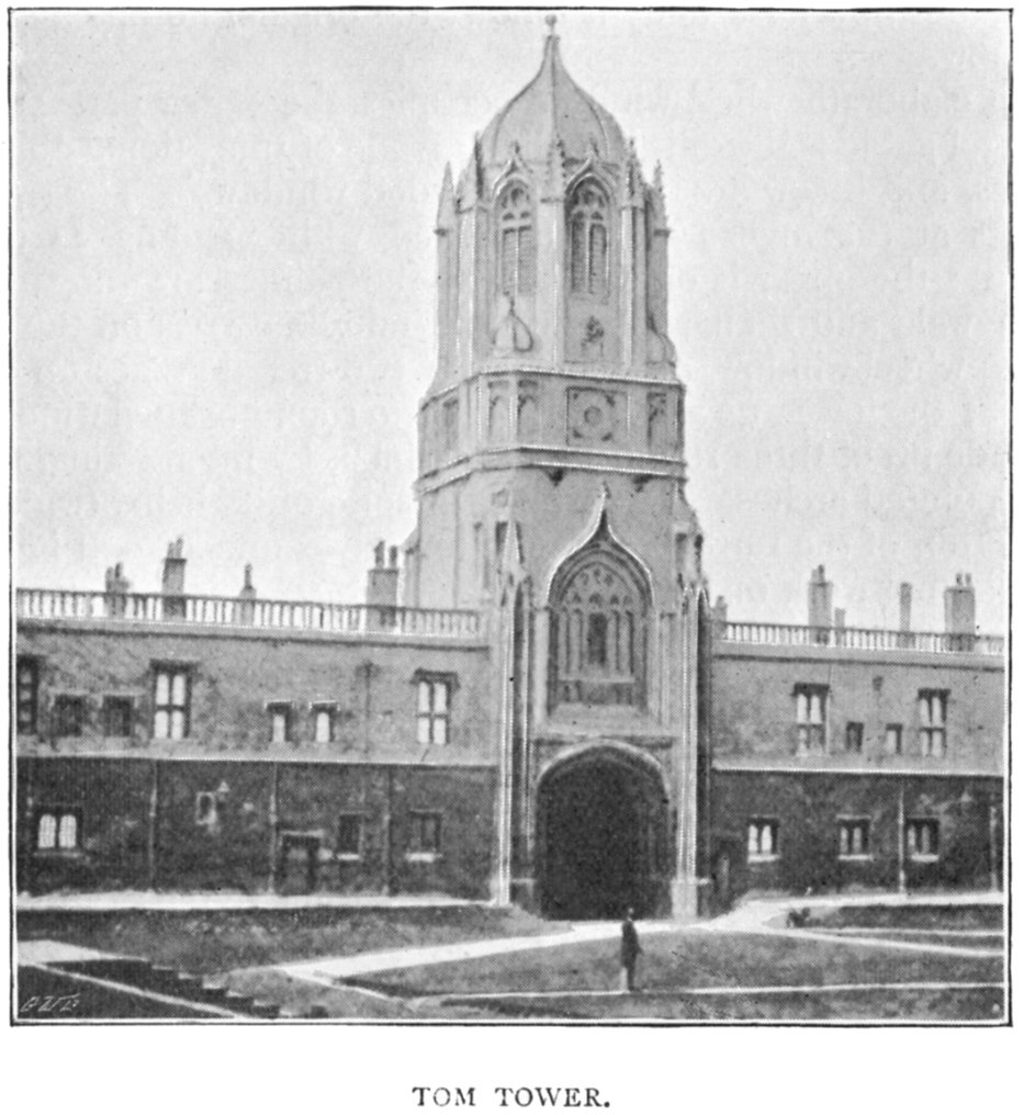 John Fell (1676-1686), the best known, and also the best of the Bishops of Oxford, was well-fitted to restore the traditions of the place; for his father Samuel Fell was Dean of Christ Church from 1637-1649, and had been elected student of the House as far back as 1601: thus John Fell must have had an intimate knowledge of the traditions of Christ Church as far back as the third interregnum of Elizabeth. A strong royalist, Fell kept in seclusion till the Restoration, when, in 1660, he was made Dean. He at once commenced to restore both the discipline and the buildings of the College. On his appointment to the Bishopric, he was permitted to retain the Deanery as well, in order "that he might better carry on his noble designs, which were so many that they contributed to wear him quite out and shorten his life." He employed Sir Christopher Wren to build Tom Tower, and finished the north side of Tom Quadrangle; he also built a new episcopal palace upon the ruins of the old one at Cuddesden. He founded ten exhibitions, and caused the University Theatre to be erected, and the Printing Press to be "advanced to a glory superior to any place in Christendom." He showed exemplary care in governing his diocese, and established daily prayers at St. Martin's (as the principal city church of Oxford) at eight in the morning and eight at night. His most important book is the "Life of Dr. Henry Hammond," 1660; he also wrote several theological books, edited St. Cyprian's works, and produced a well-known edition of the New Testament. He died in 1686, "having by a most pious unspotted single life left behind him an everlasting character," and was buried in the cathedral, where, in the ante-chapel, there is a monument to him. There is also a beautiful statue of him over the archway that leads past the deanery into Peckwater Quadrangle, by Mr. Bodley.