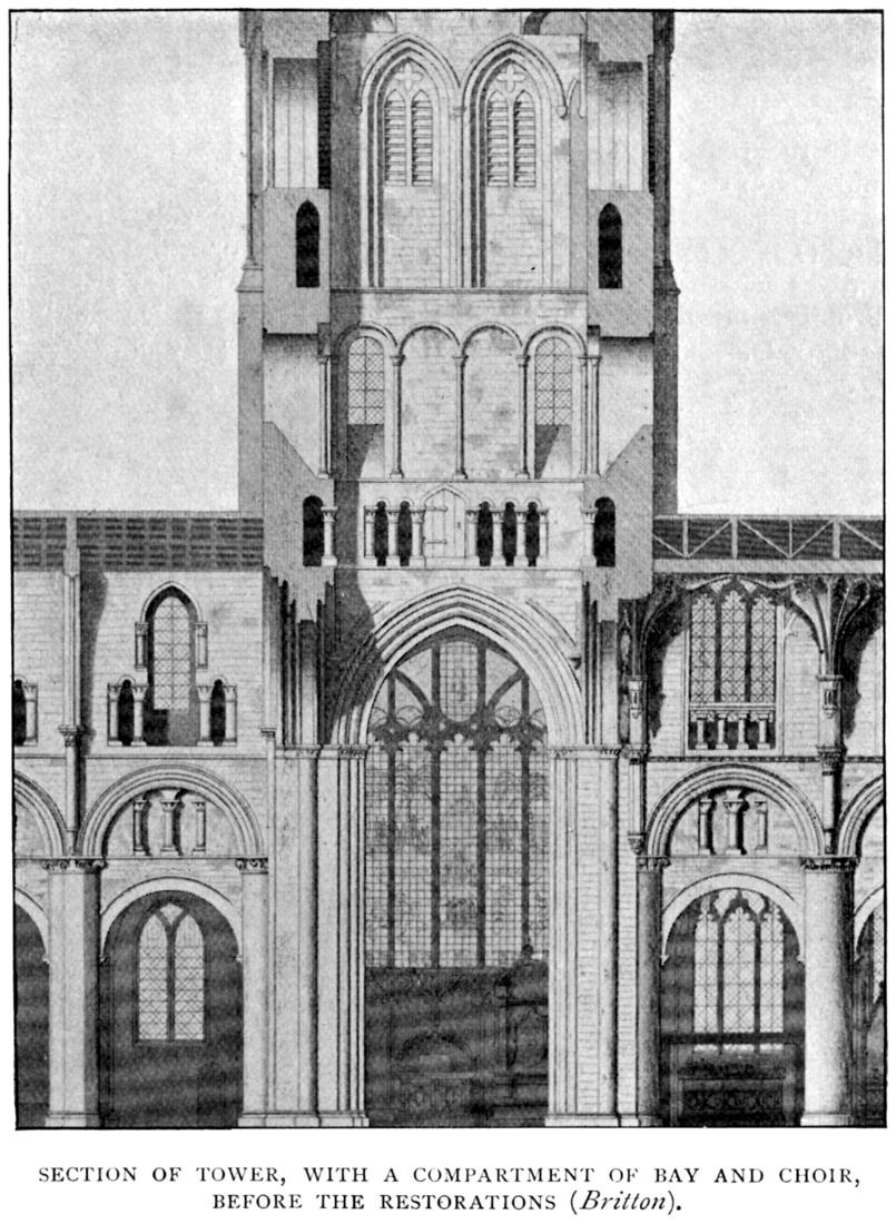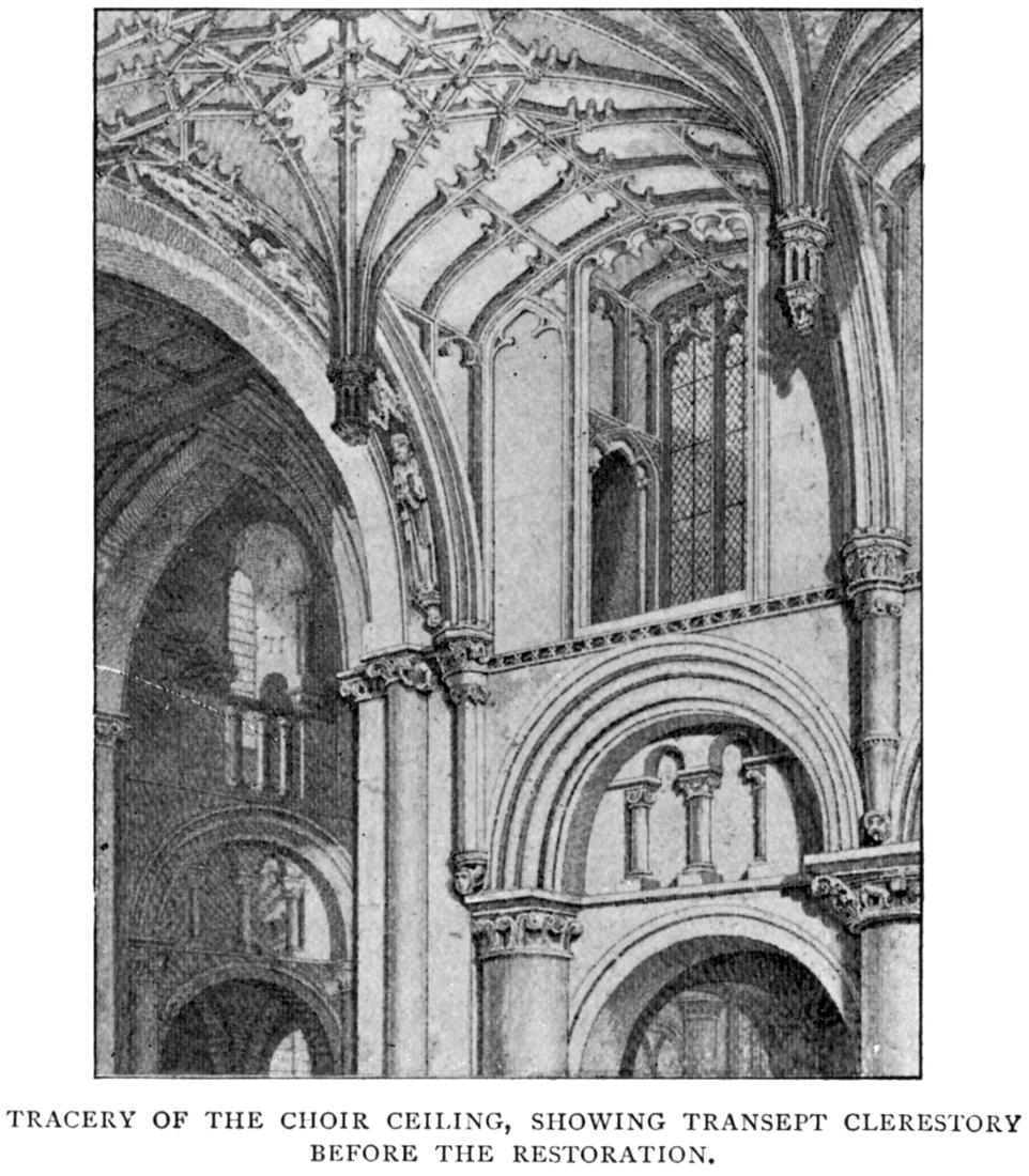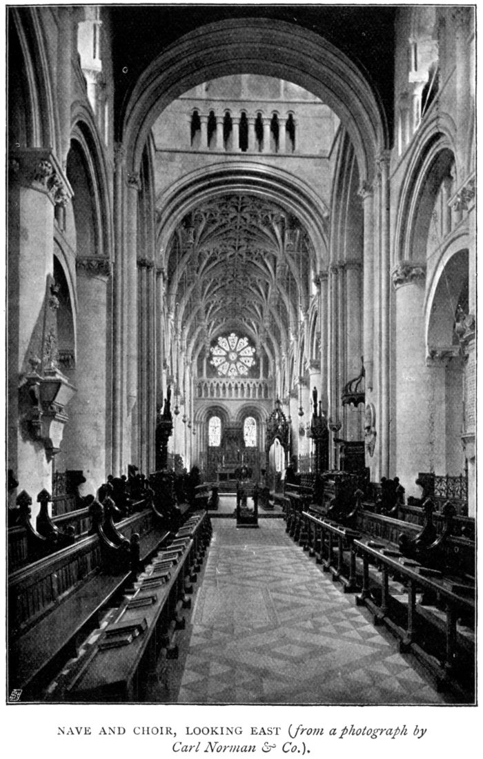 The "Cathedral Church of Christ in Oxford" has had a somewhat unfortunate history. Built for the small monastery of St. Frideswide, with no thought of any ampler destination, it was in the sixteenth century raised to the rank of a cathedral, just after it had been reduced in size by the destruction of the bays of the nave, and sunk out of sight among a mass of college buildings. Nor was this all the indignity it suffered; for it had also to do duty as the chapel of the new academic foundation which Wolsey established, and very soon the cathedral was forgotten in the college chapel. So neglected was it that Britton wrote at the beginning of the present century—"It is very common for visitors, and even those of rather refined and critical minds, to leave Oxford without examining the building now under notice." A century earlier Browne Willis had been content to make the astounding observation: "'Tis truly no elegant structure."