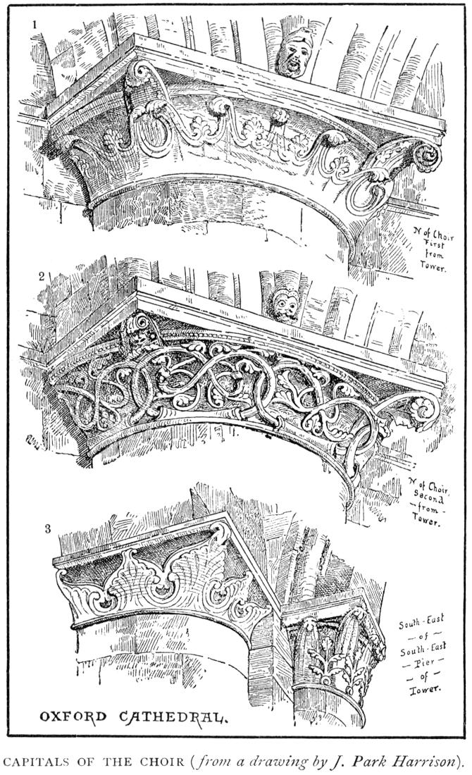 For one who has learnt the best of what he knows within Christ Church walls it has been very pleasant to gather these notes of the Cathedral's history and architecture. Moreover, I am less remorseful than I might be at adding to the world's overcrowded library, because certain recent discoveries in the Cathedral have thrown the best of the old books out of date, and made it necessary for some one to weave together the older and the later knowledge. My indebtedness, therefore, is not only to former labourers in this field, but especially to the author of these discoveries, Mr J. Park Harrison, who roused my enthusiasm in the old days, and now has most generously helped me with his advice, and allowed me to incorporate in these chapters the substance of his own papers. To these pamphlets I would refer any who wish to go to the fountainhead for the account of the investigations, and especially I may mention two: "The Pre-Norman Date of the Choir and some of the Stone-work of Oxford Cathedral," and the "Account of the Discovery of the Remains of three Apses at Oxford Cathedral" (Oxford: Frowde, 24 and 23 pp.). I must also express my thanks for the kindness and help of Professor York Powell, and of Mr W. Francis, the senior verger, and to Messrs Carl Norman & Co. of Tunbridge Wells, Mr W. Giles, Mr Park Harrison, and Mr R. Phené Spiers, F.R.I.B.A., for the loan of and permission to reproduce various drawings and photographs.