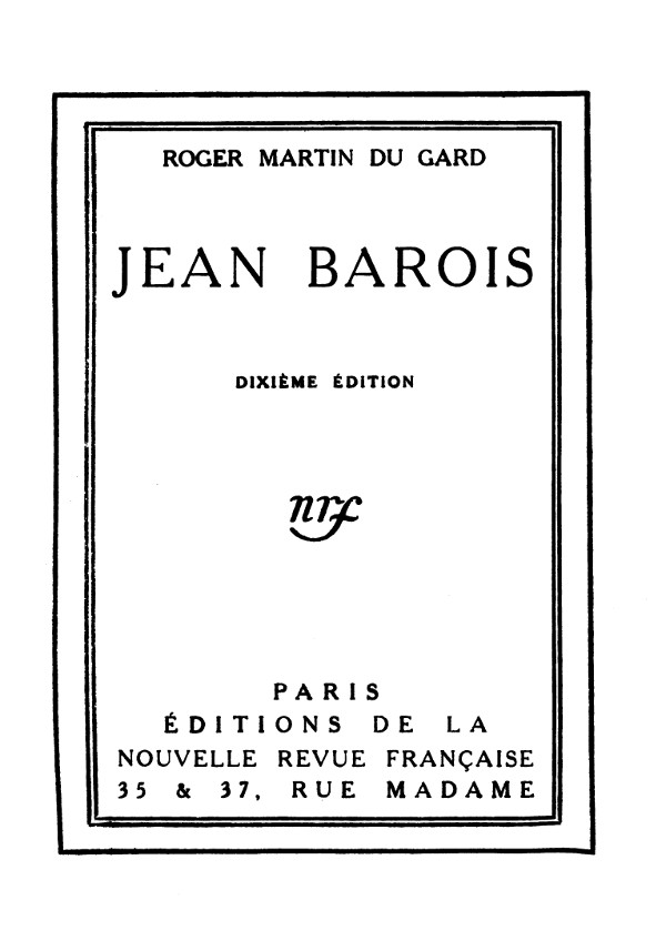 The Project Gutenberg EBook of Jean Barois, by Roger Martin du Gard This eBook is for the use of anyone anywhere in the United States and most other parts of the world at no cost and with almost no restrictions whatsoever. You may copy it, give it away or re-use it under the terms of the Project Gutenberg License included with this eBook or online at www.gutenberg.org. If you are not located in the United States, you'll have to check the laws of the country where you are located before using this ebook. Title: Jean Barois Author: Roger Martin du Gard Release Date: August 17, 2015 [EBook #49725] Language: French Character set encoding: UTF-8 *** START OF THIS PROJECT GUTENBERG EBOOK JEAN BAROIS *** Produced by Madeleine Fournier.