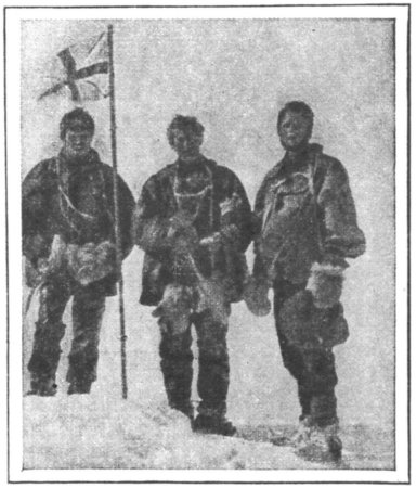 Part of Shackleton’s expedition reached for the first time the South Magnetic Pole—that is, where the south part of the compass needle points. Those in the picture, reading from left to right, are Dr. Mackay, Professor David, and Douglas Mawson.