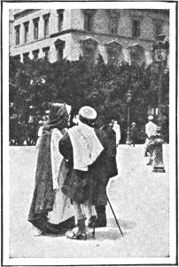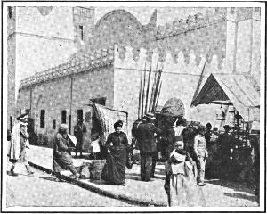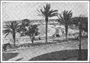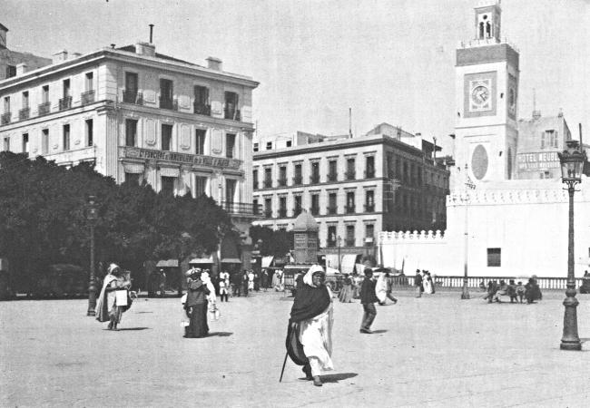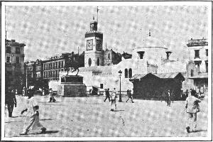 From the entrance to the harbor Algiers appears like a white diamond set in a circle of emeralds. The town consists of two parts, the French and the Arab quarters. To the visitor from the west Algiers is most interesting; for there he meets characters of all kinds, European peoples mixing with those of North Africa. The French quarters show that the Frenchman, when compelled to live in another country, takes a bit of Paris with him; for there is found the typical French café, with its little tables on the sidewalk, contrasting with the Arab café where natives, in their picturesque white costumes, sit and sip their coffee and gossip with wild gesticulation. Even in its African population Algiers is oddly mixed. Each tribe has its own peculiar costume, the marketplace often looking like a stage of a comic opera, only much more artistic and natural.
