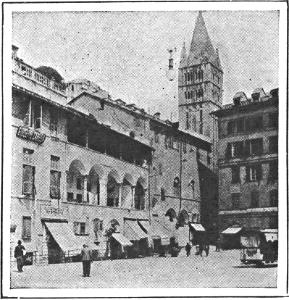On landing at the pier the traveler quickly finds himself in the attractive Palazzo Doria, named after Andrea Doria, (do´-ree-ah) the famous admiral of Charles V. It is well for the visitor, especially if an American, to take this course, following up the Via Doria to the square in front of the railway station; for there, surrounded by flowers and palms, stands a fine monument of Christopher Columbus; who, it will be remembered, was a native of the city. Genoa is full of stirring activity. If you have gone there from some of the quieter towns along the Riviera, you will feel a change in spirit. You are inclined to move a little faster. Things are happening all the time. There is much to be seen, and all that you see tells a story of years of vigorous, successful civic life. The most notable physical features of Genoa are its fine medieval churches and its many splendid sixteenth century palaces.