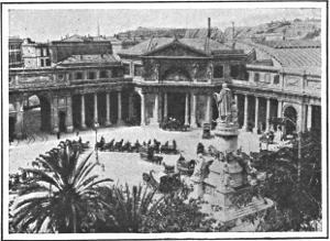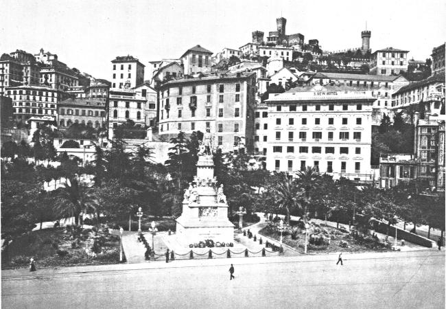 Follow up the Via Garibaldi, a magnificent street with many beautiful palaces on both sides. To vary the impressions of fine architectural display take a ride in the tramway up to San Nicolo (nee-ko-lo´) and Castellaccio (cahs-tel-ah´-cho), where you will find yourself over a thousand feet high, and commanding a superb view of the Bisagno (bih-sahn´-yo) Valley and the Campo Santo (kahm´-po sahn´-to) below you. The cemetery called Campo Santo is one of the most interesting features of Genoa. It is beautifully situated, and is filled with remarkable monuments, some of them executed by the leading sculptors of Italy. In the burial spots of the Genoese, as well as in the homes where they live, there is much of luxury and elegance. In its business activities, its social life, its climate, and its customs, Genoa is attractive, and holds the visitor there for sometime content.