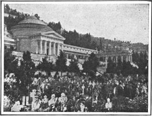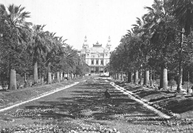 The Casino building is very theatrical in style, built expressly for its purpose, and superbly placed on a promontory overlooking the sea and town. It is surrounded by beautiful gardens, carefully kept. In fact, the whole place is a delight to the eye and the most beautiful spot on the Riviera. It is attractive enough to detain one for days, even if the great magnet, the Casino, were not there. On account of the gaming, the whole district is filled with characters that one had rather not meet except in the Casino, where perfect order is assured by the presence of numerous detectives, ready to check disorder when it threatens, or to notify politely anyone of suicidal tendency to leave the Casino and the principality. There is no place in the world where arrangements are so well planned to satisfy the desire of human beings to get something for nothing. And it is not simply a gaming place. The spectacle of Monte Carlo has a great fascination even for those who never play at the tables, everything is so beautiful, so orderly, and so well kept. Many who visit there prefer, however, to stop at Mentone, which is but a few minutes distant by trolley or motorcar.