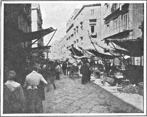 There are travelers of years of experience who have declared that the site and surroundings of Naples are not excelled in beauty anywhere in the world. You enter the Bay of Naples with the island of Ischia (es´-kee-ah) on one side and on the other the island of Capri (kah´-pree). Immediately before you lies Naples, stretching out from the water’s edge up the hills beyond; the second largest city in Italy, with a population of over five hundred thousand. Back of it and to the southeast is Vesuvius. History has taught us to look with feelings of respect and awe upon that smoke-crowned cone. On the shore, to the south, Herculaneum (her-kew-lay´-nee-um) and Pompeii (pom-pay´-yee) are to be seen, and as the coast curves out to the peninsula you come to Sorrento (sore-ren´-to) and the road along the mountainside that takes you on a scenic tour of matchless beauty, including Amalfi (ah-mahl´-fee), Vietri (vee-ay´-tree), and Salerno (sah-ler´-no).